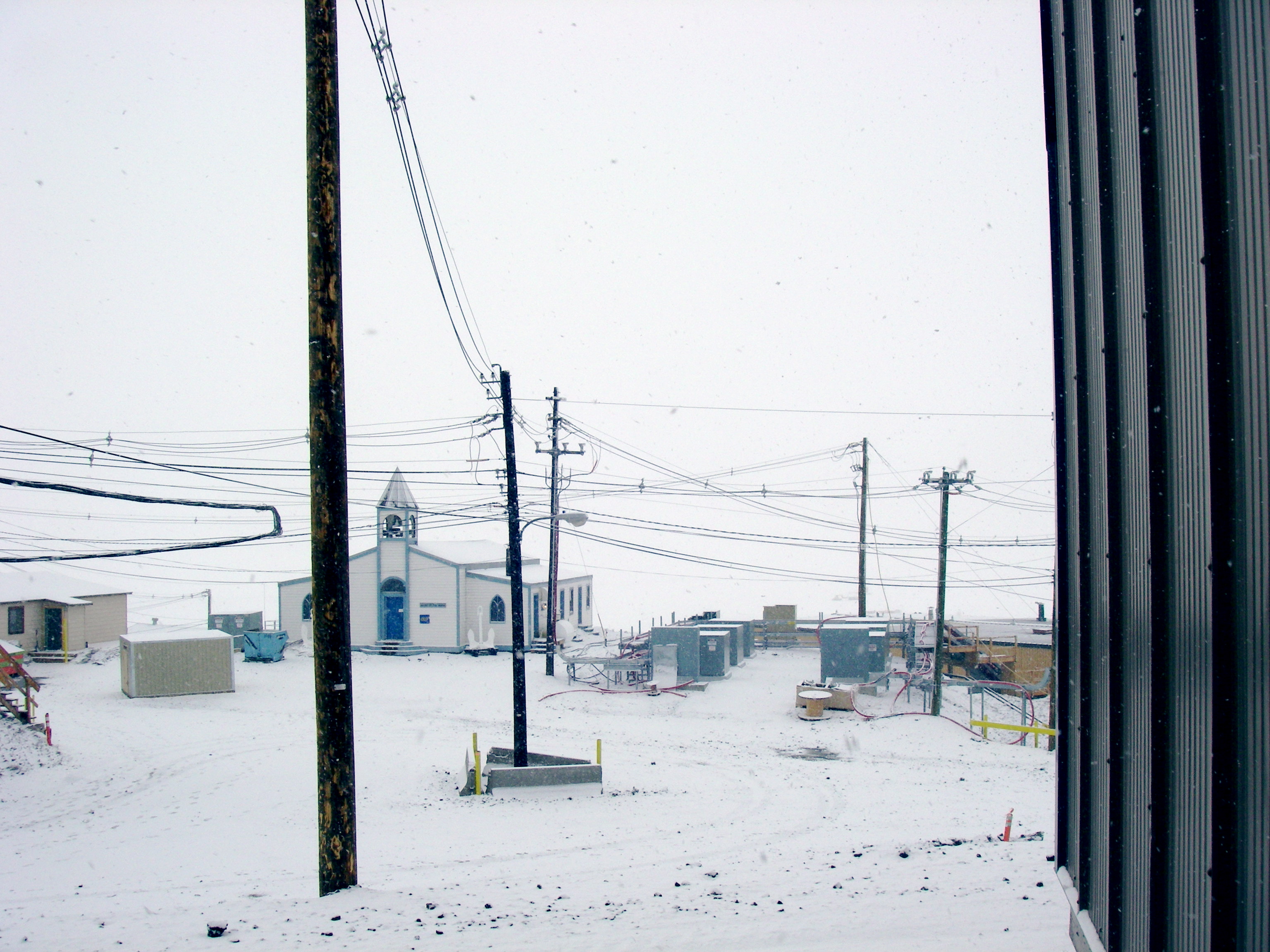 A view from the corner of Ann Linsley's room. The church looks over the sea ice of McMurdo Sound. McMurdo Station, Antarctica.