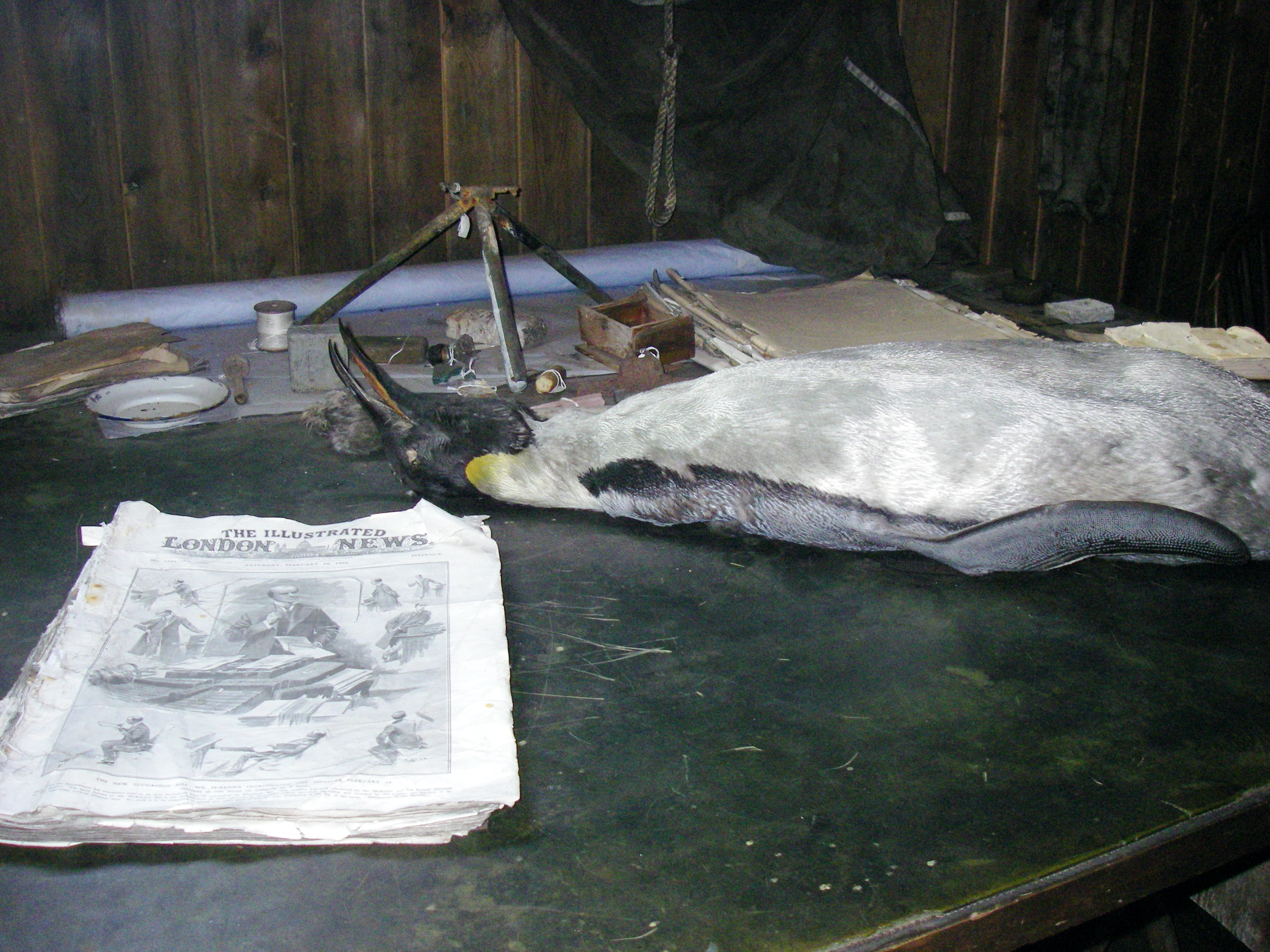 Inside Scott's Expedition Hut at the edge of Mt. Erebus. This is Scott's desk complete with the famous penguin and the newspaper dating to the days before his departure to reach the South Pole in 1913. Expedition Hut for R.F. Scott, Ross Island, Antarctica.