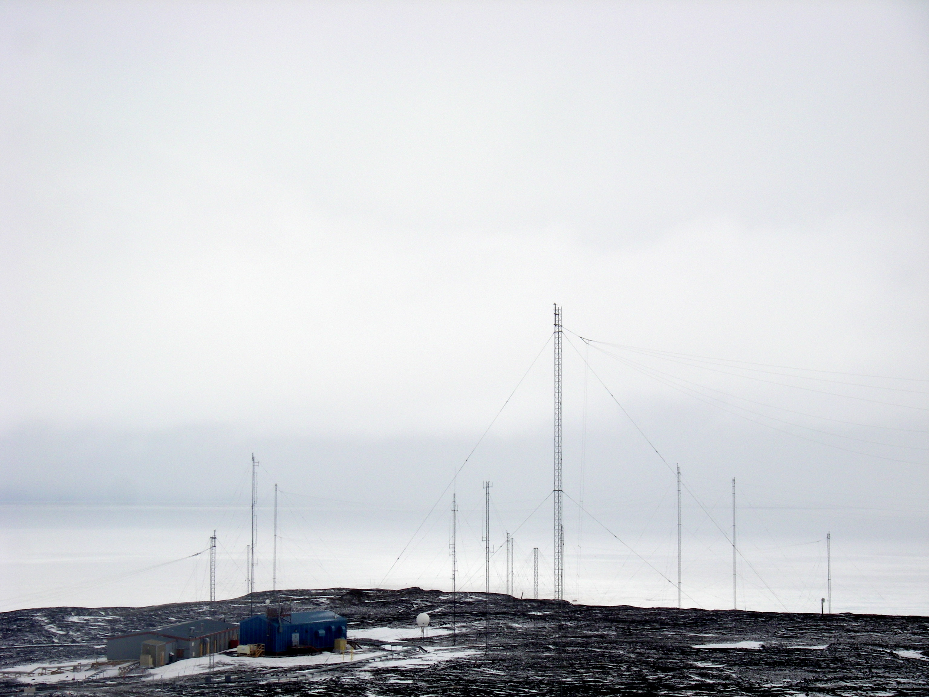 Ann Linsley: "Either used to spy on the Soviet Union and China or to contact martians in outer space. No one could quite tell me why and for what purpose all of these radio towers were in this one restricted site. We tested here anyway." Near McMurdo Station, Antarctica.