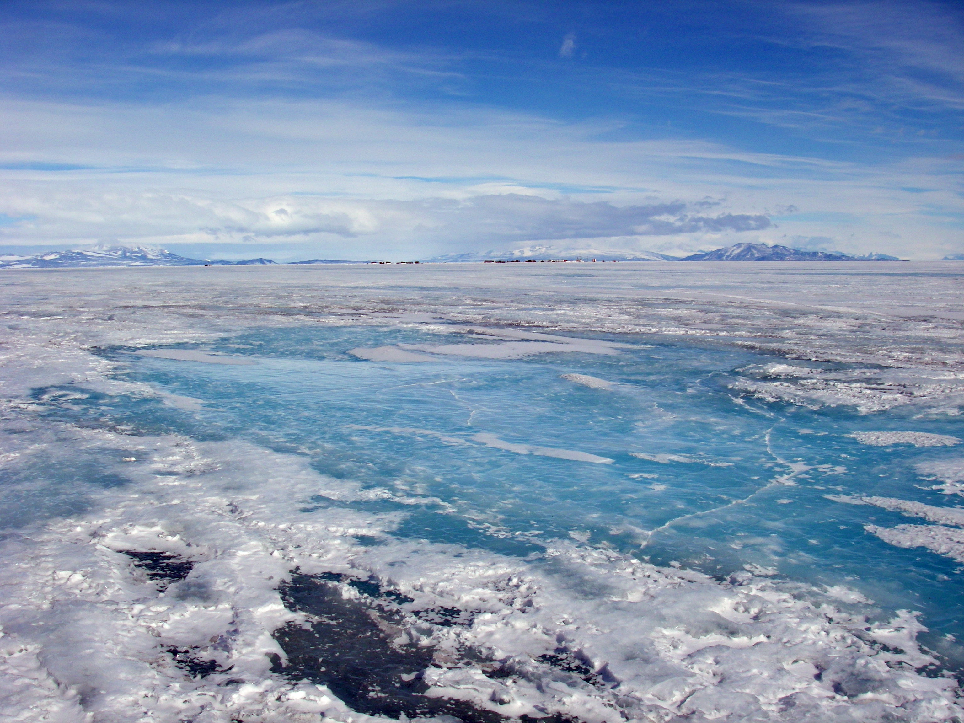Ann Linsley: "I thought the sea ice was spectacular in contrast with the sky. The blue shades of both gave the illusion that the floor could be the ceiling or vice versa. The sea ice had spectacular formations the closer you reached the pressure ridges." Looking west across the sea ice in the vicinity of McMurdo Station, Antarctica.