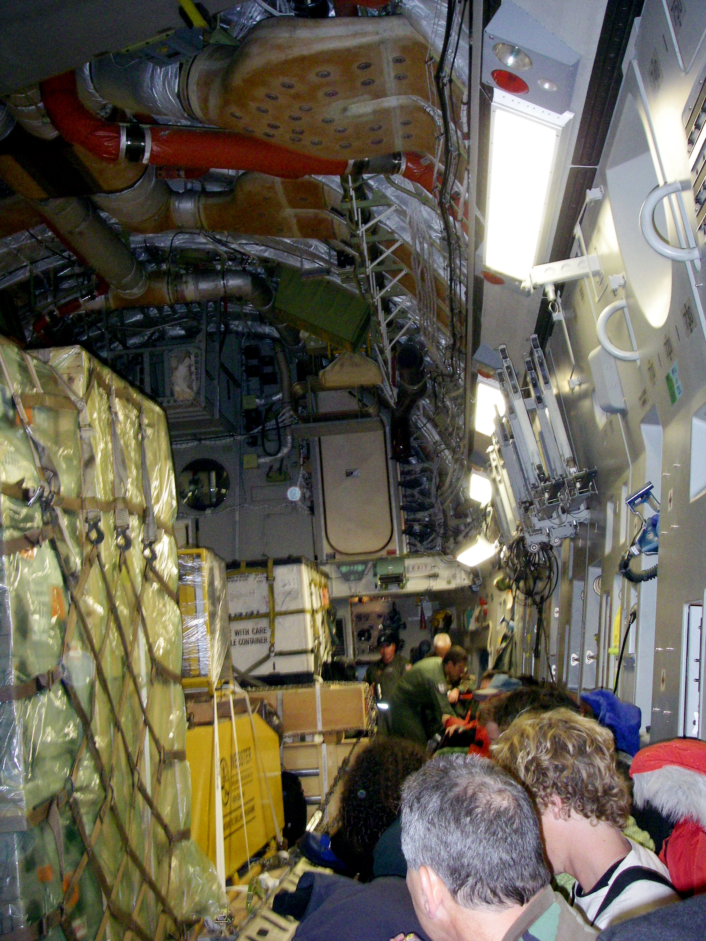 Inside the C-17 from McCard Airforce Base. Cargo is most important, support staff and research personnel are secondary. En route to Antarctica somewhere over the Southern Ocean.