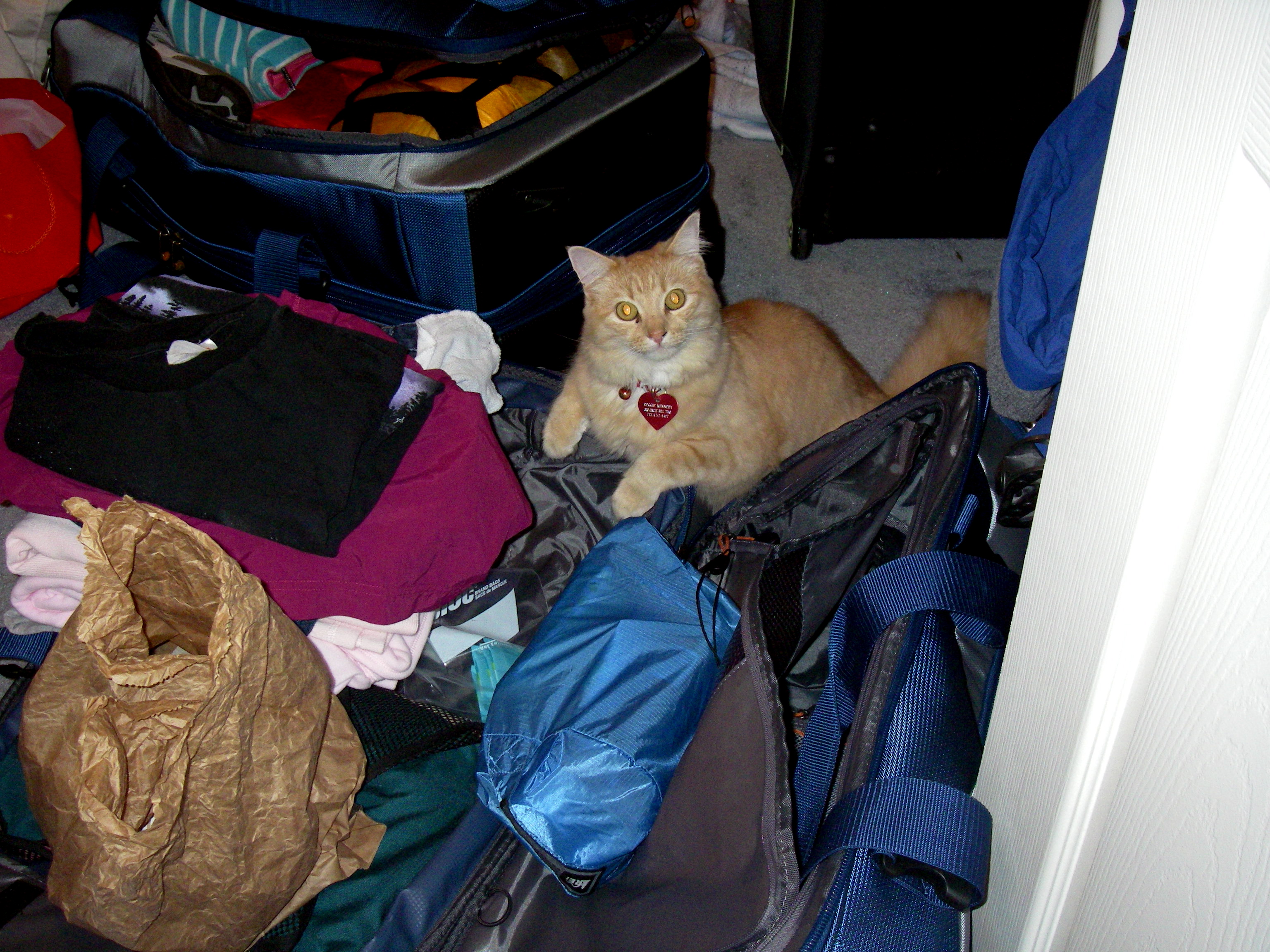 Ann Linsley packs to leave for two months while her cat inspects. Bellaire, Texas.