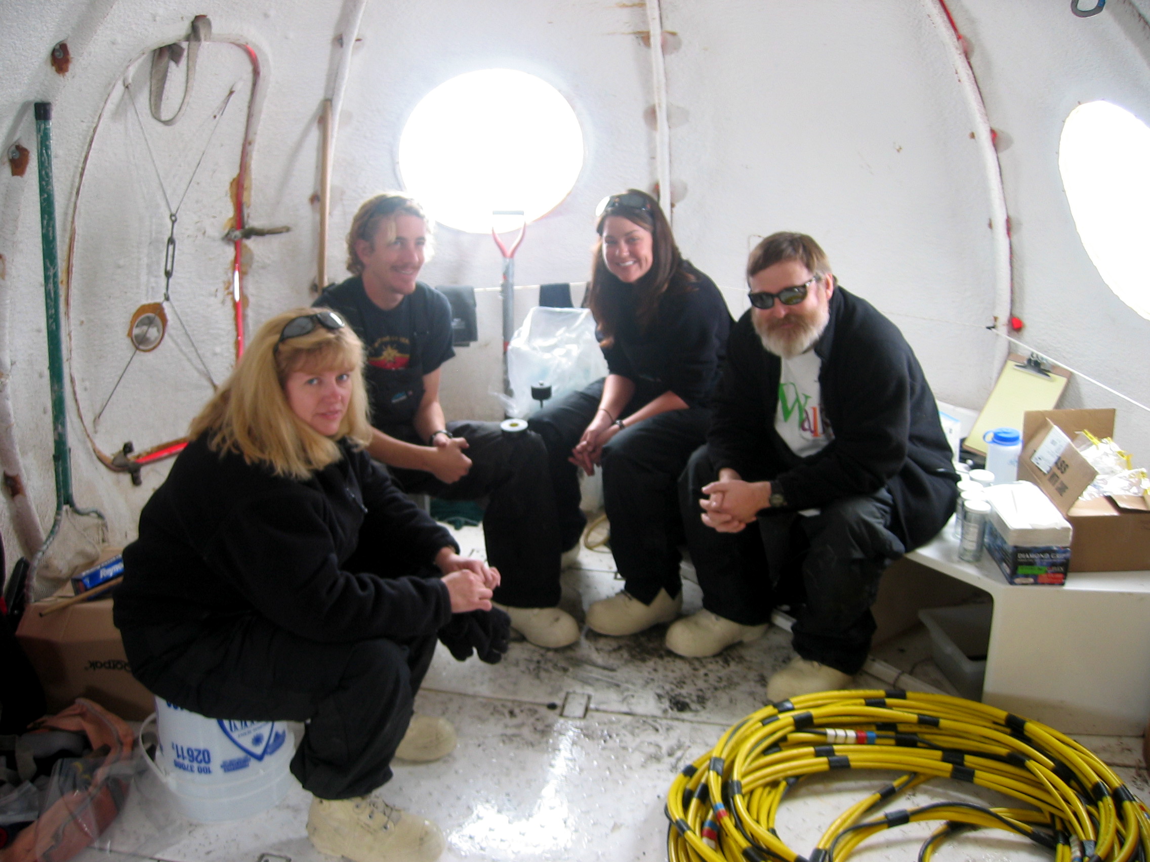 The team waits inside the dive hut for the diver to return with samples. Harbor of McMurdo Sound, McMurdo Station, Antarctica.