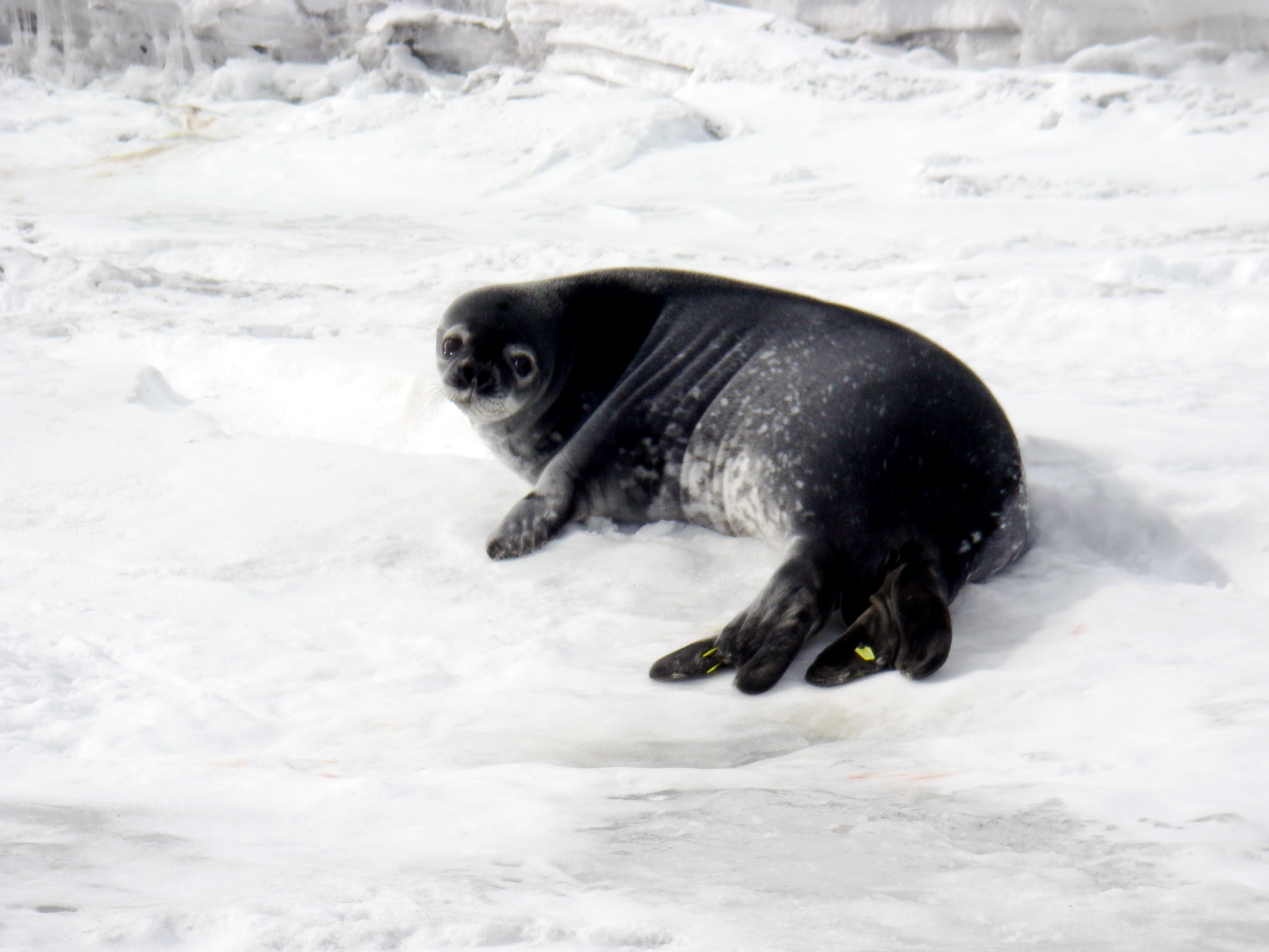 Weddell seal pup near the edge of the Barne Glacier, on the sea ice of McMurdo Sound, Antarctica.