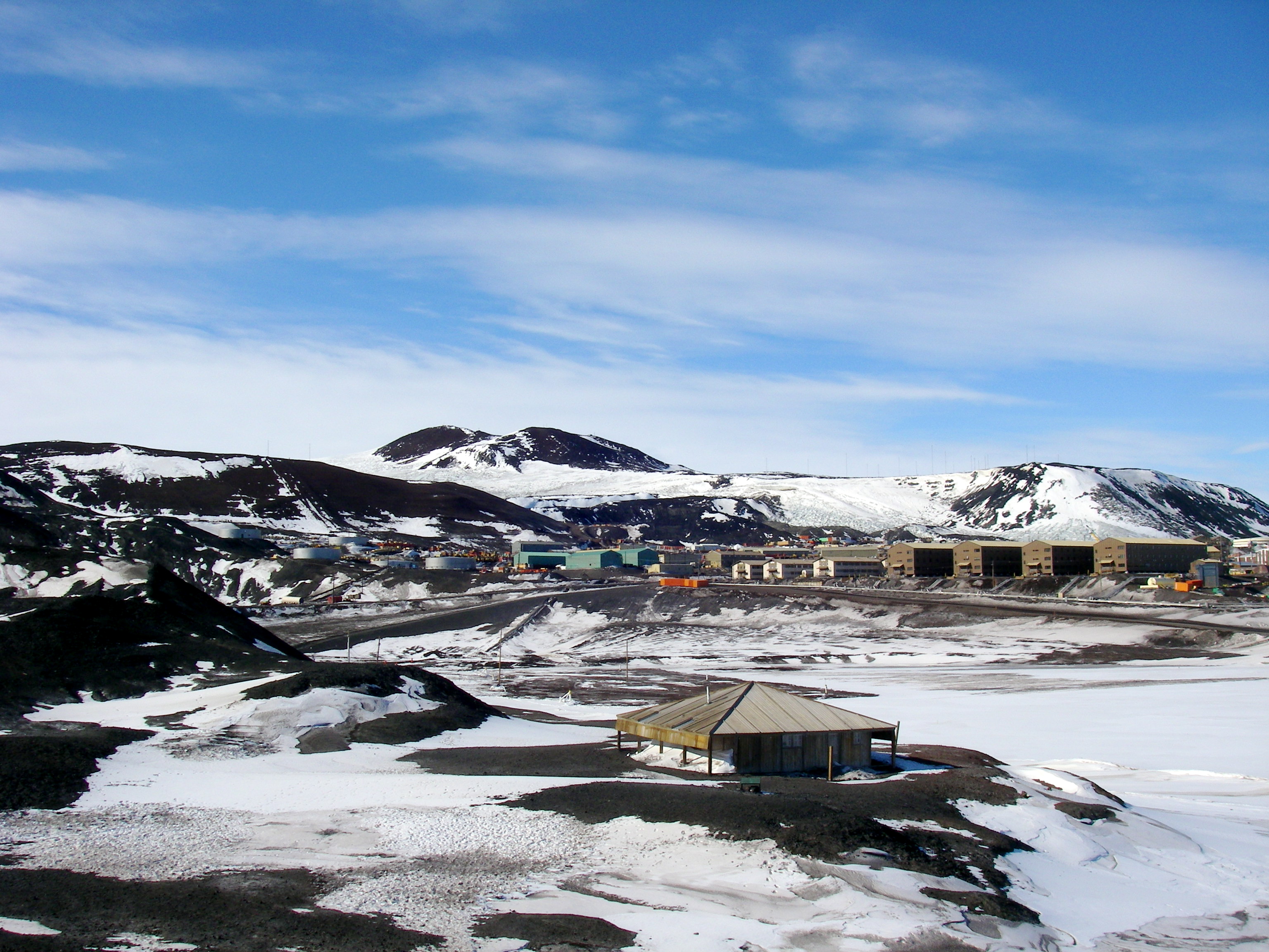 McMurdo Station. Scott's Hut at Hut Point. Supply ships dock in the inlet area when the sound is open. Note the black volcanic rock.