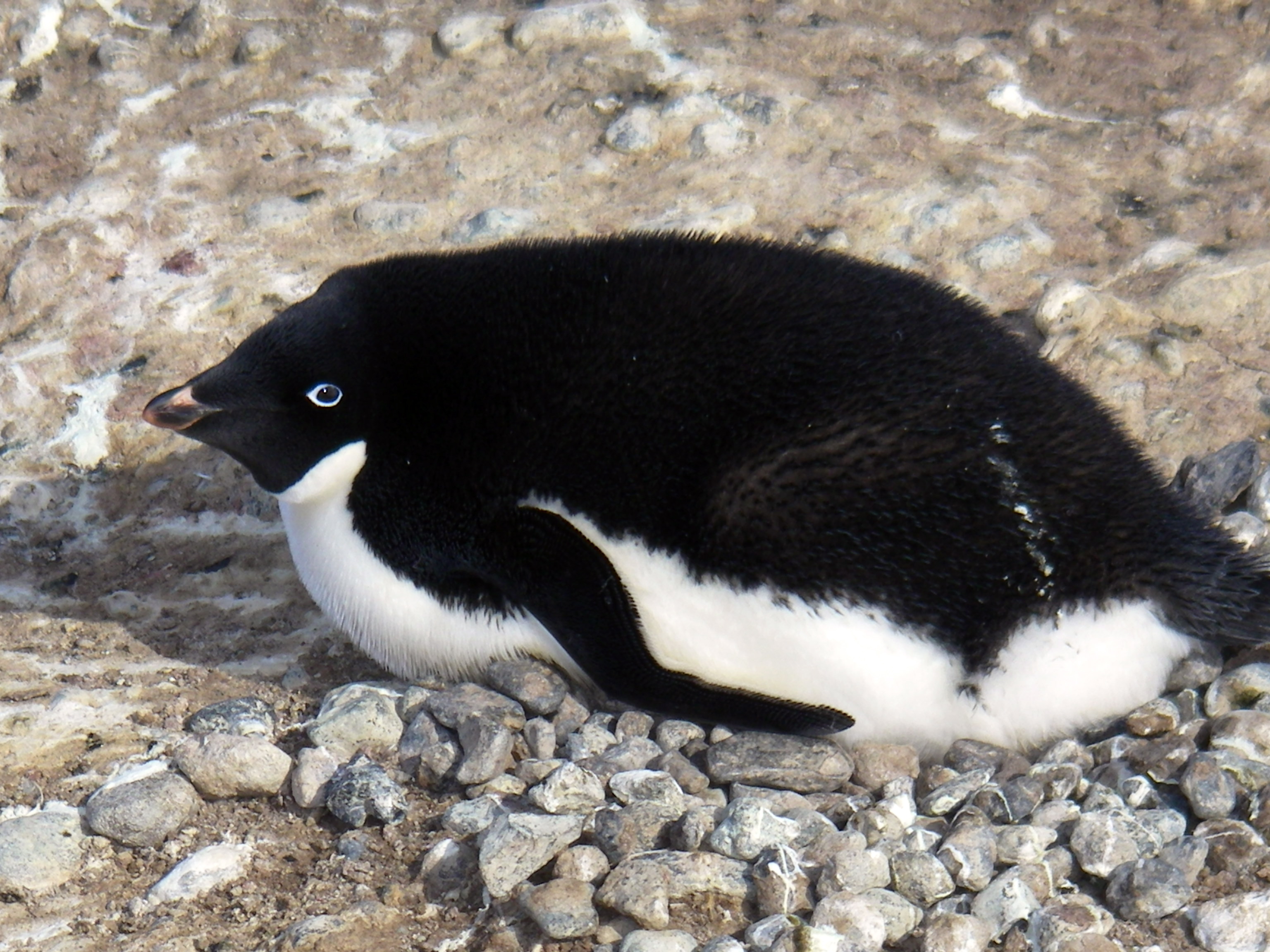 A male Adélie penguin lying on his egg on his rock nest on the beach at Cape Bird, Antarctica.