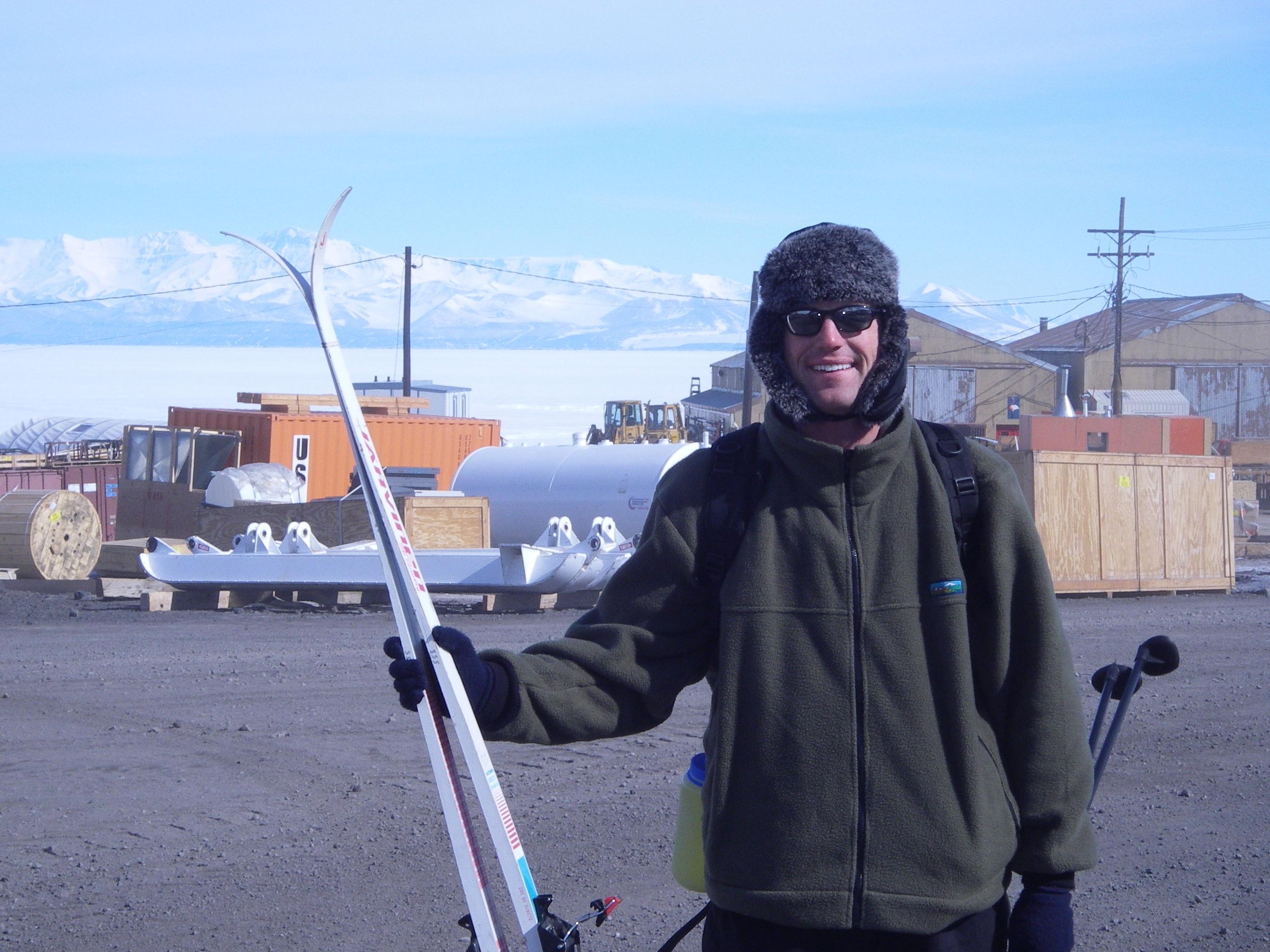 Brandon Gillette stands holding cross country skis before attempting cross country skiing for the first time. McMurdo Station, Antarctica.