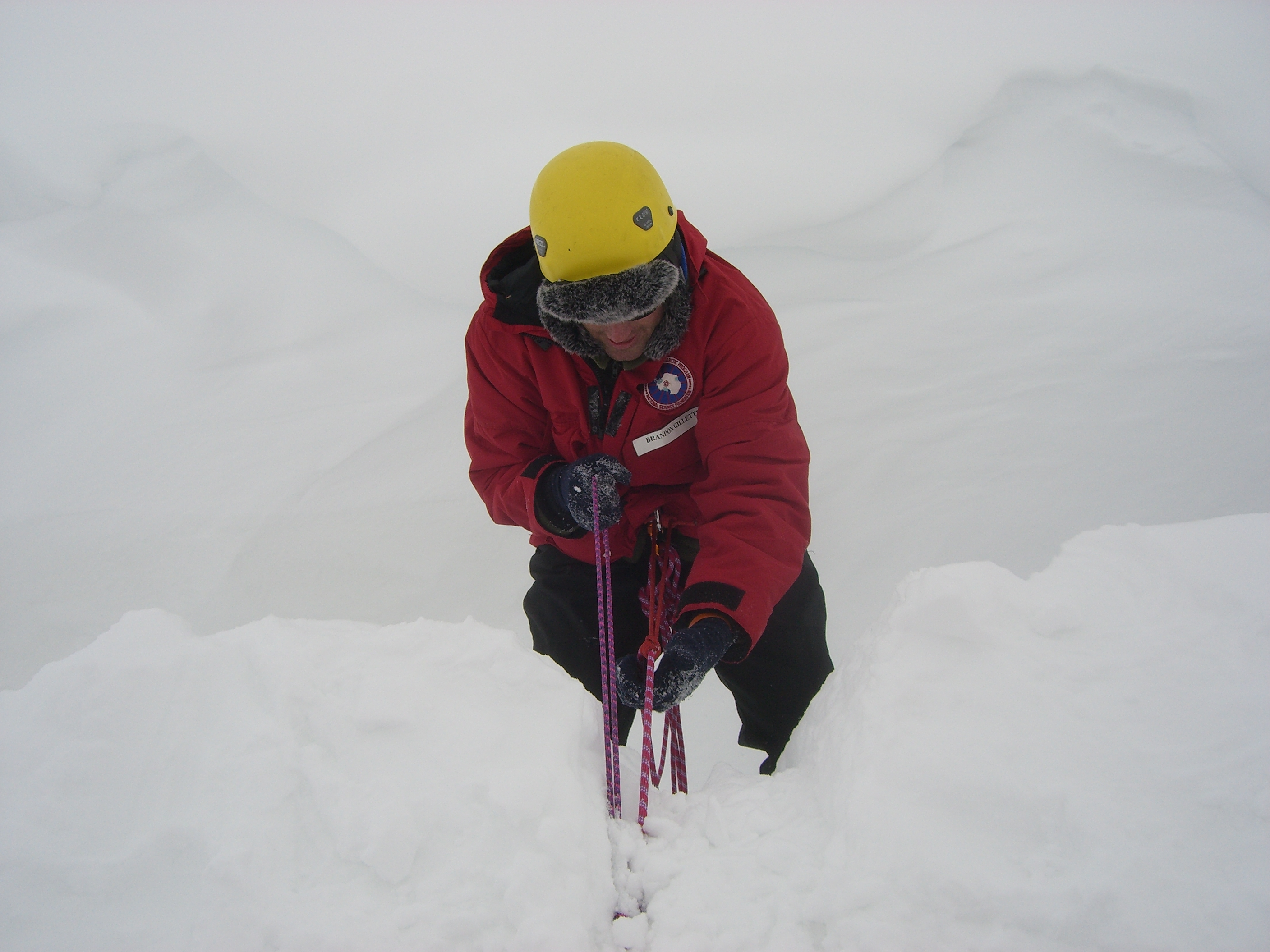 Brandon Gillette hanging from the harness before reaching to top edge of the crevasse. McMurdo Station, Antarctica.