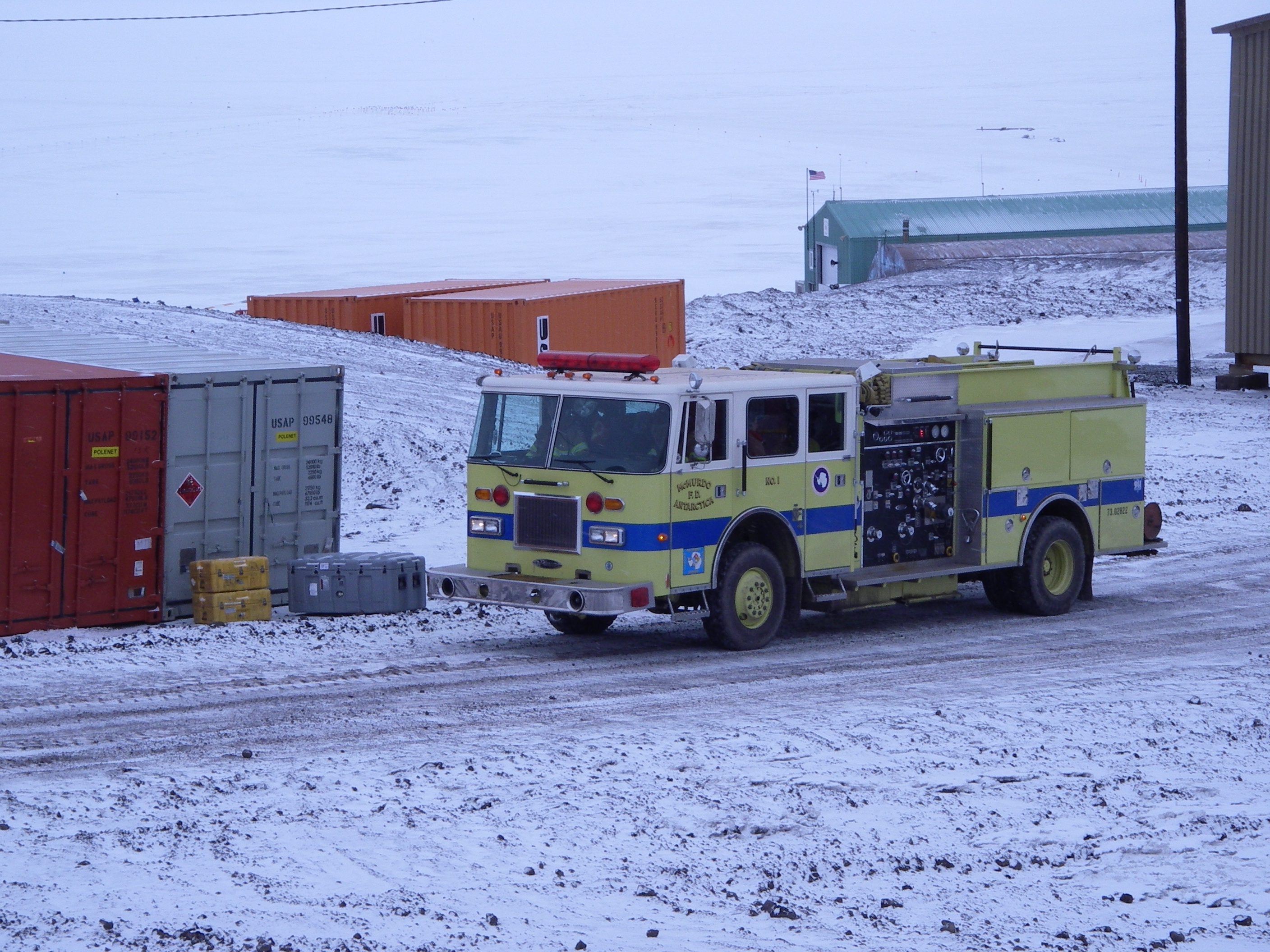 A fire truck drives through town after a light dusting of snow. McMurdo Station, Antarctica.