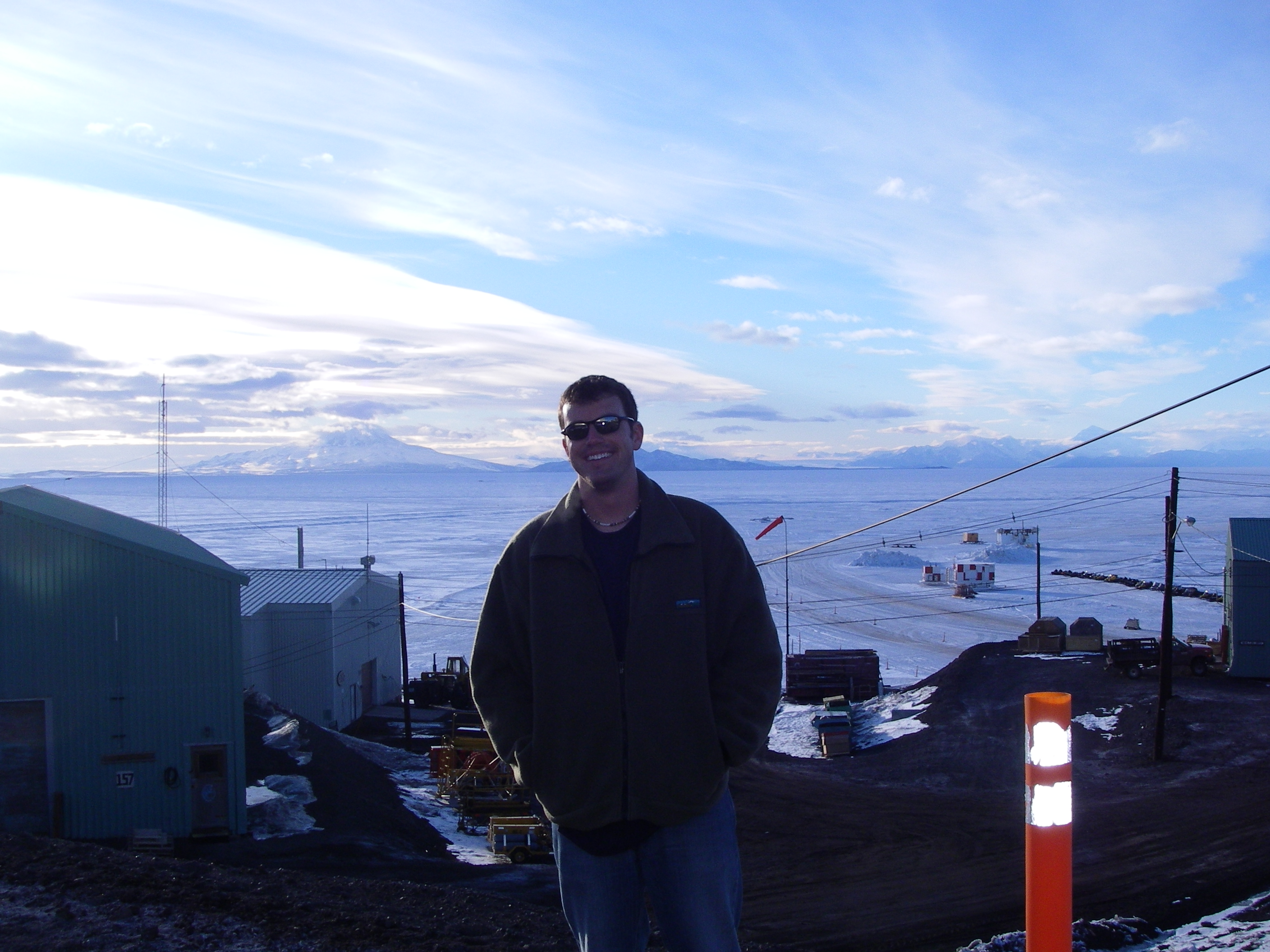 Brandon Gillette standing outside the dorms at McMurdo Station. It's 1am! McMurdo Station, Antarctica.