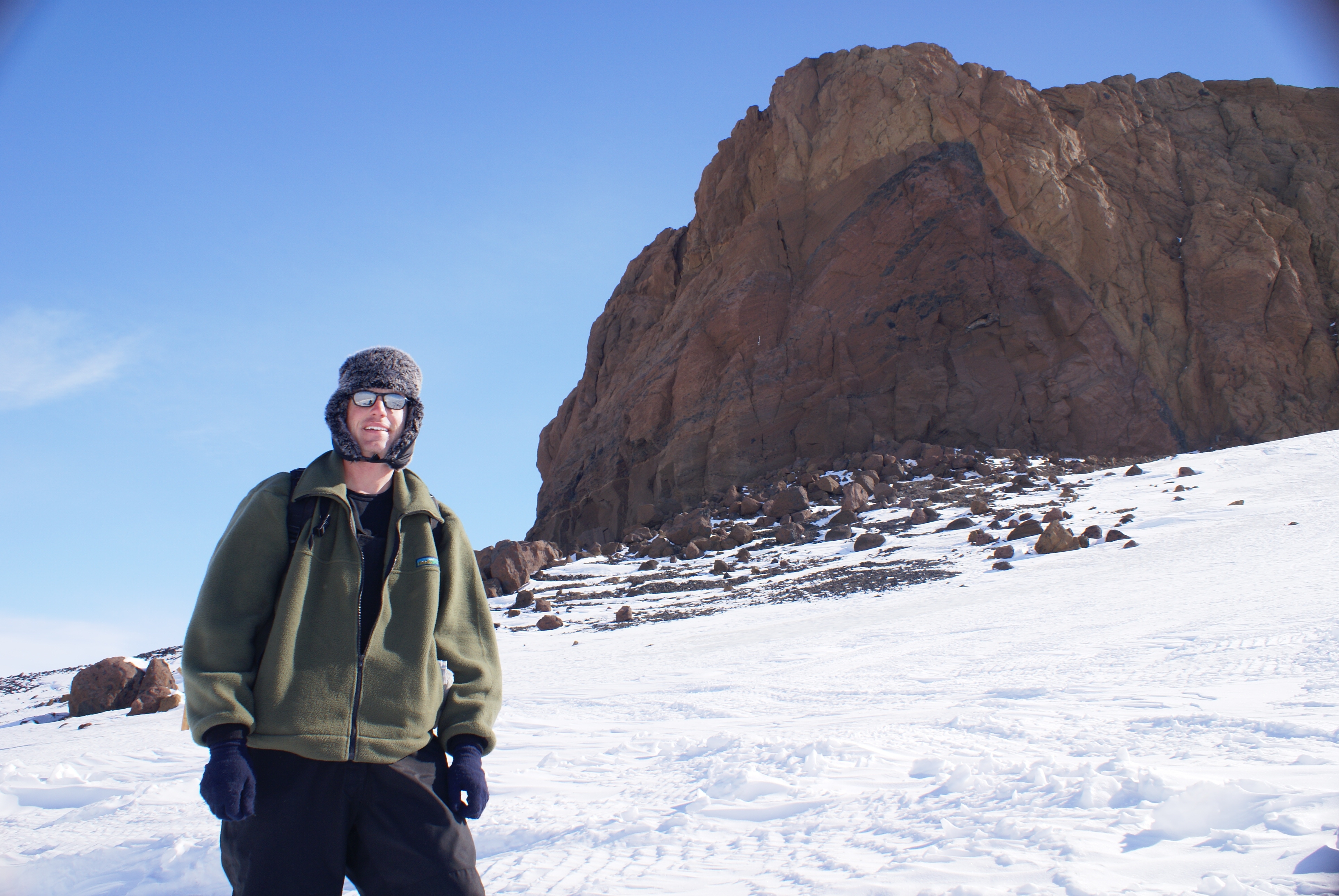 Brandon Gillette on the Castle Rock cross country ski loop. Castle Rock is in the background. McMurdo Station, Antarctica.