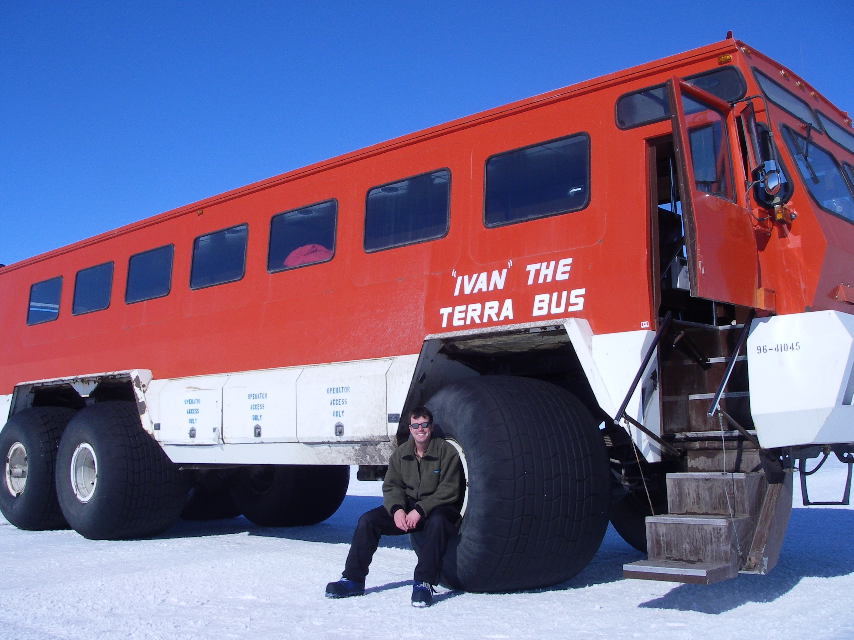 Brandon Gillette sitting inside the wheel well of 'Ivan' the Terra Bus. McMurdo Station, Antarctica.