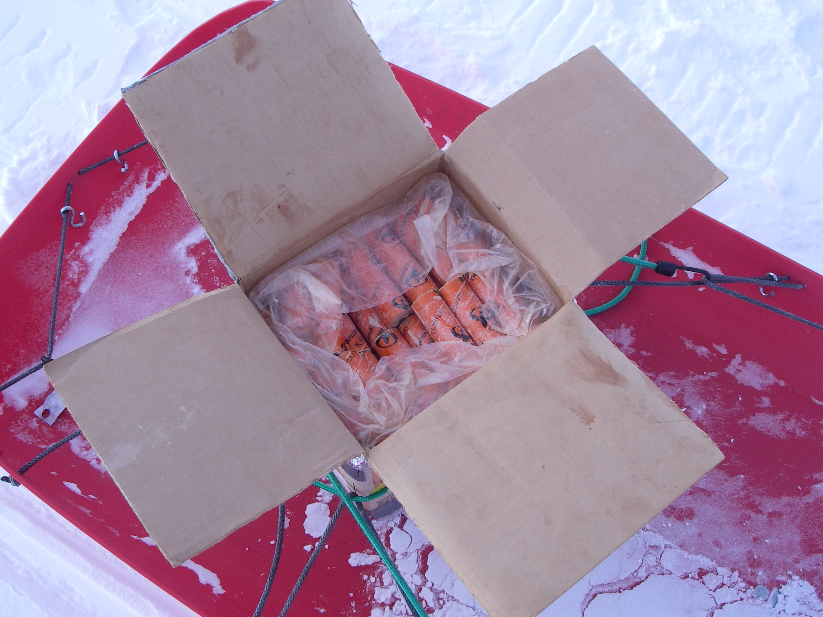 The box of explosives used to produce seismic waves to characterize the subsurface of the ice. WAIS Divide (West Antarctic Ice Sheet), Antarctica.