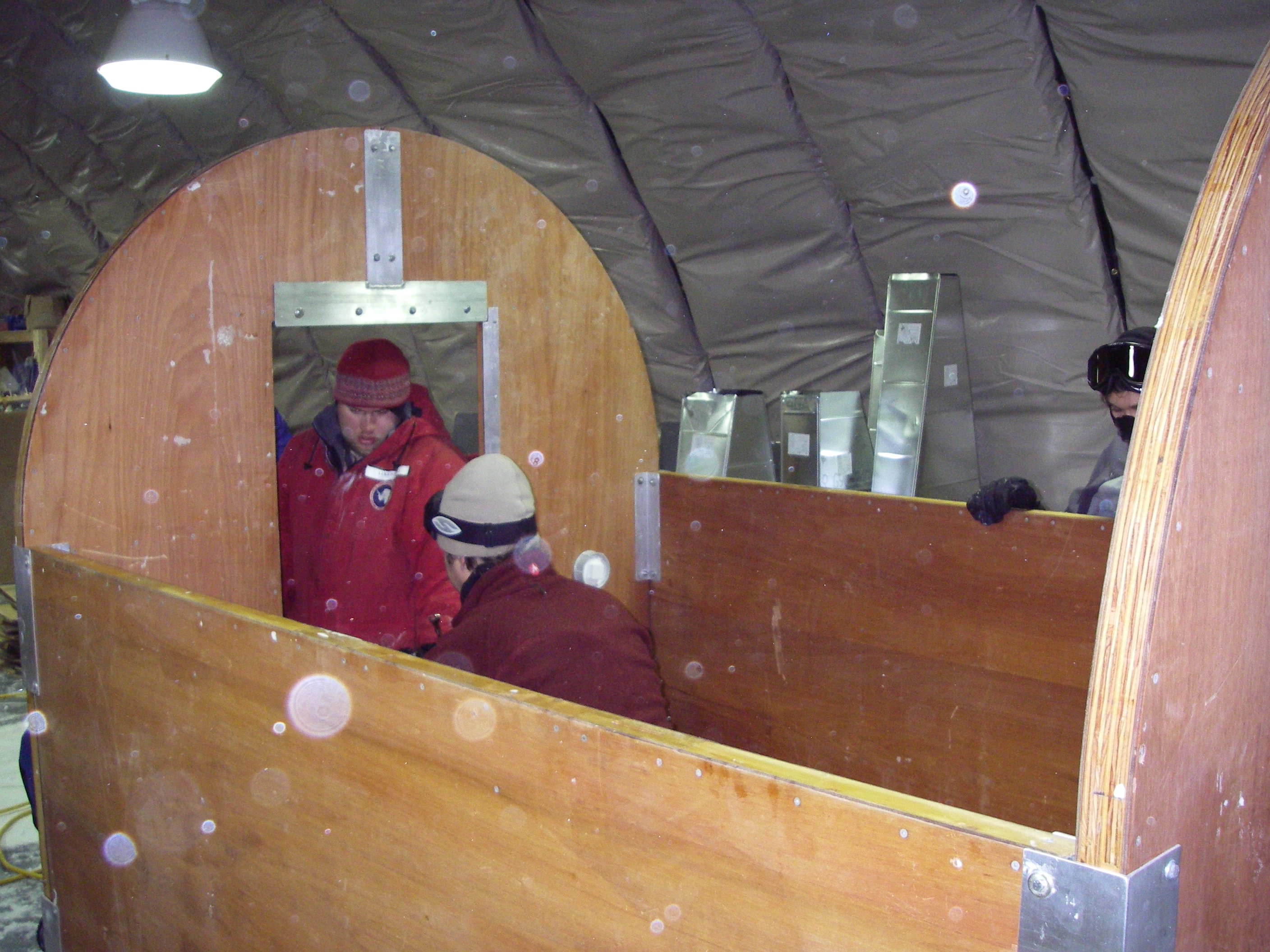 Luke Zoet, Paul Winberry, and Leo Peters work inside the Arch facility to assemble the Conestoga sled. The sled was used to house the electronics equipment while collecting seismic data. WAIS Divide (West Antarctic Ice Sheet), Antarctica.