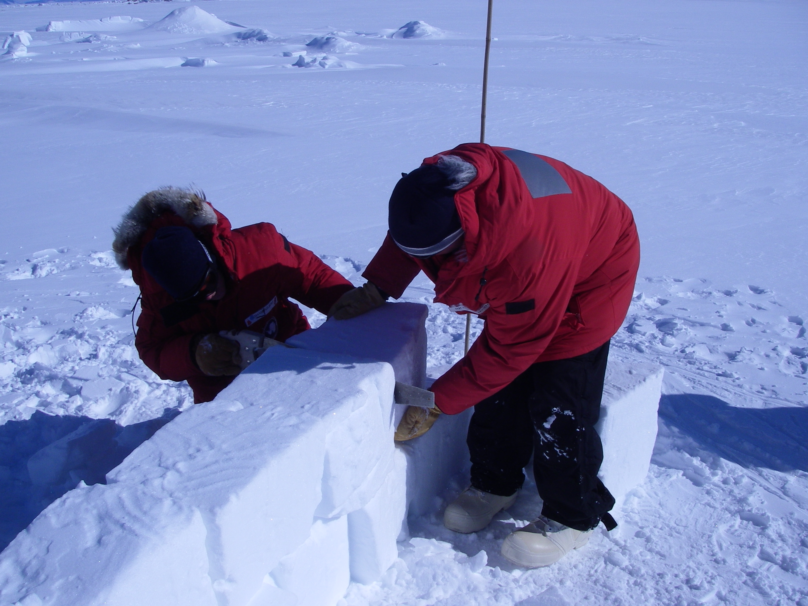 Andrea and Adam working to level the snow wall at Happy Camper School. The snow wall is for a wind break. Near McMurdo Station, Antarctica.