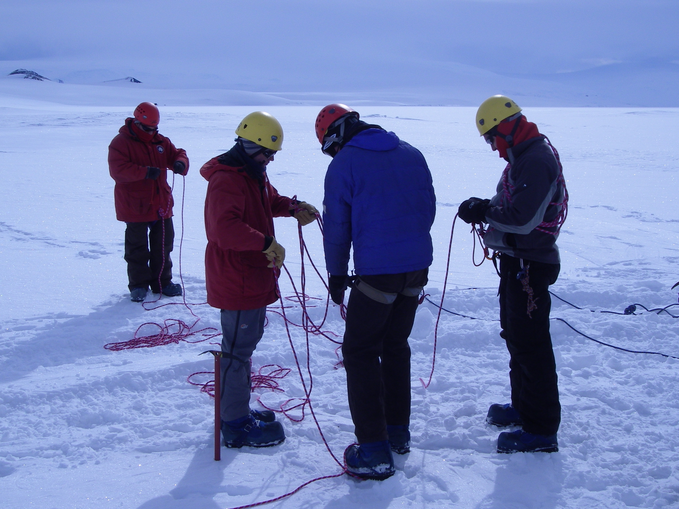 The CReSIS team checking the harnesses before training along a glacial traverse. McMurdo Station, Antarctica.