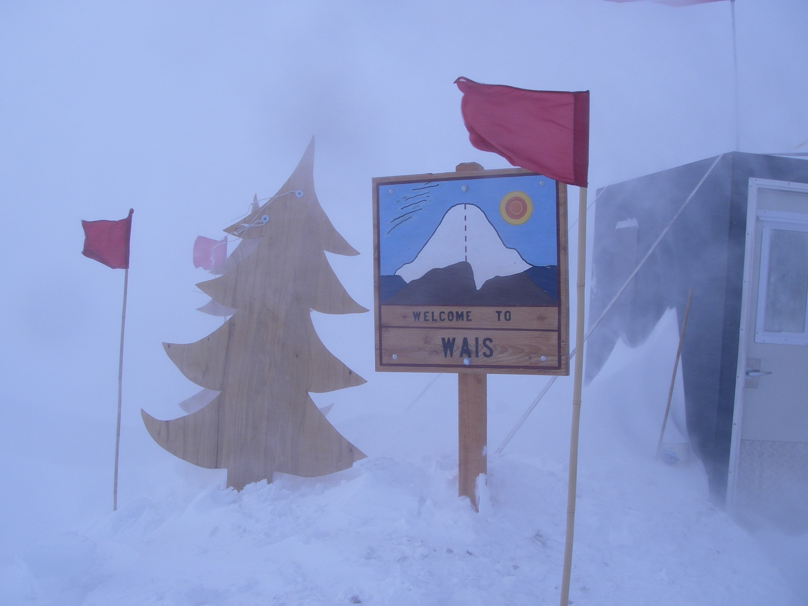 The WAIS Divide sign outside the galley before the brunt of the storm hits. WAIS Divide (West Antarctic Ice Sheet), Antarctica.