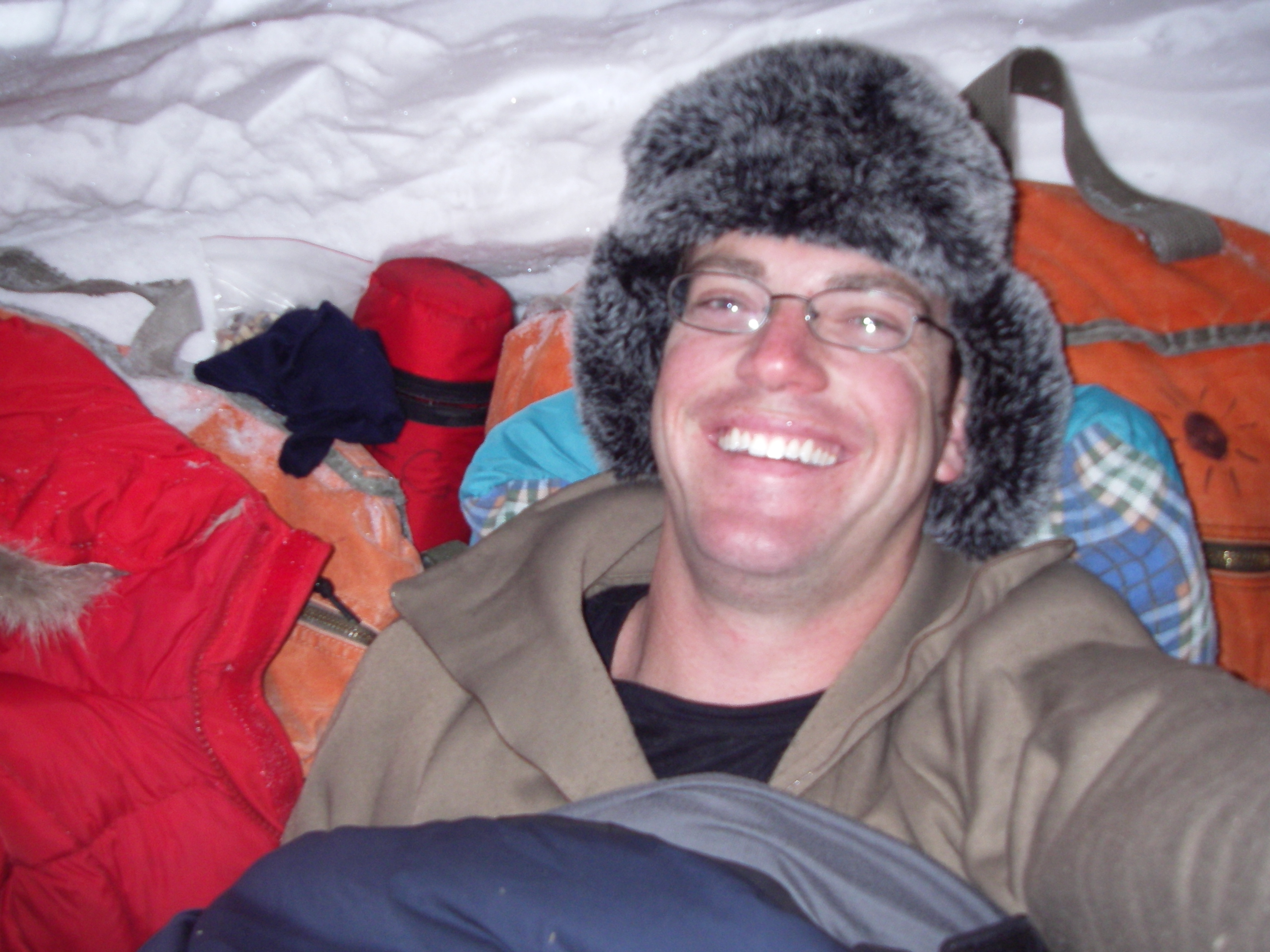 Brandon Gillette preparing to sleep inside an ice cave at Happy Camper School. McMurdo Station, Antarctica.