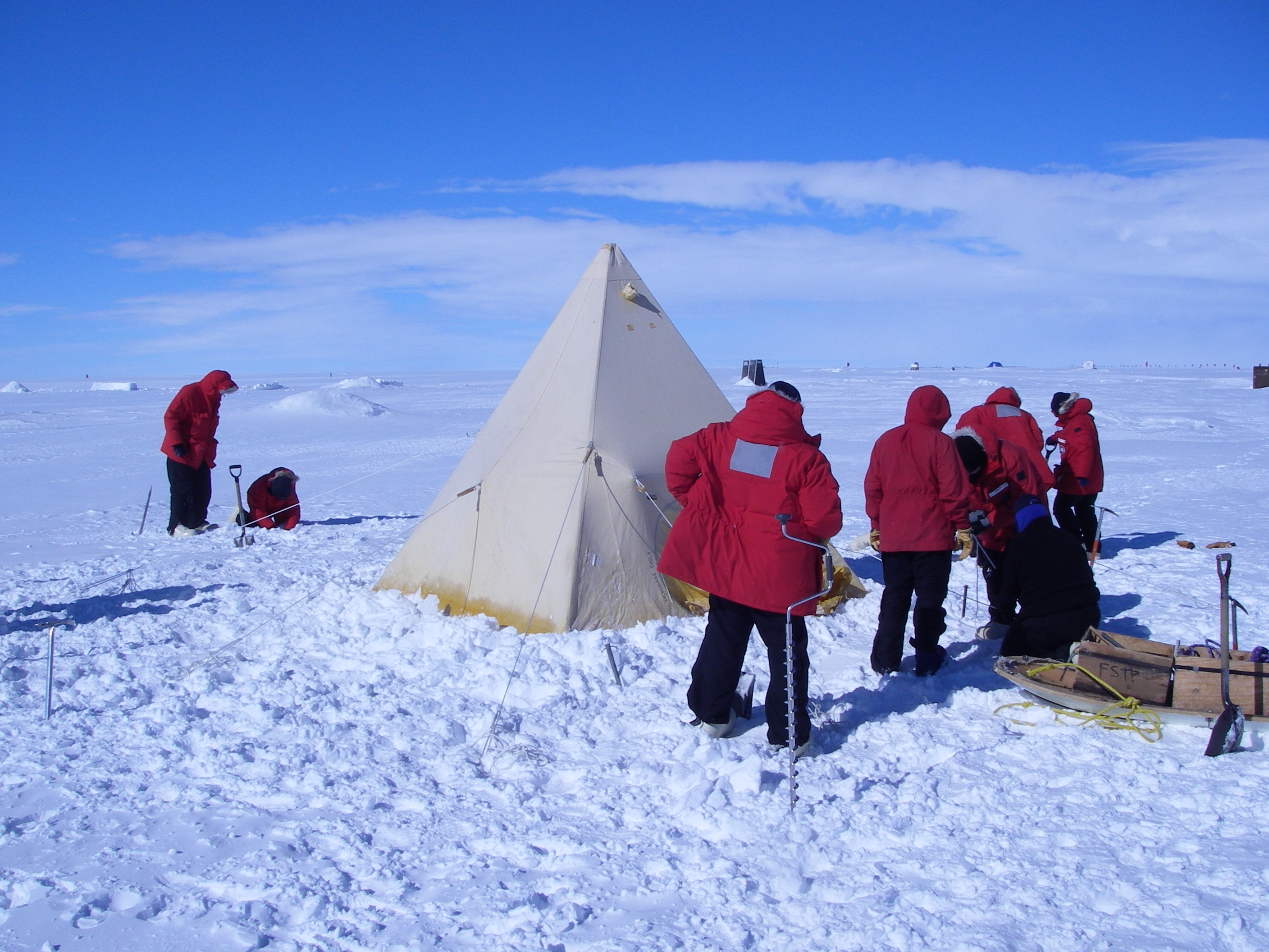 The Happy Camper team assembling a Scott Tent. Happy Camper School, near McMurdo Station, Antarctica.