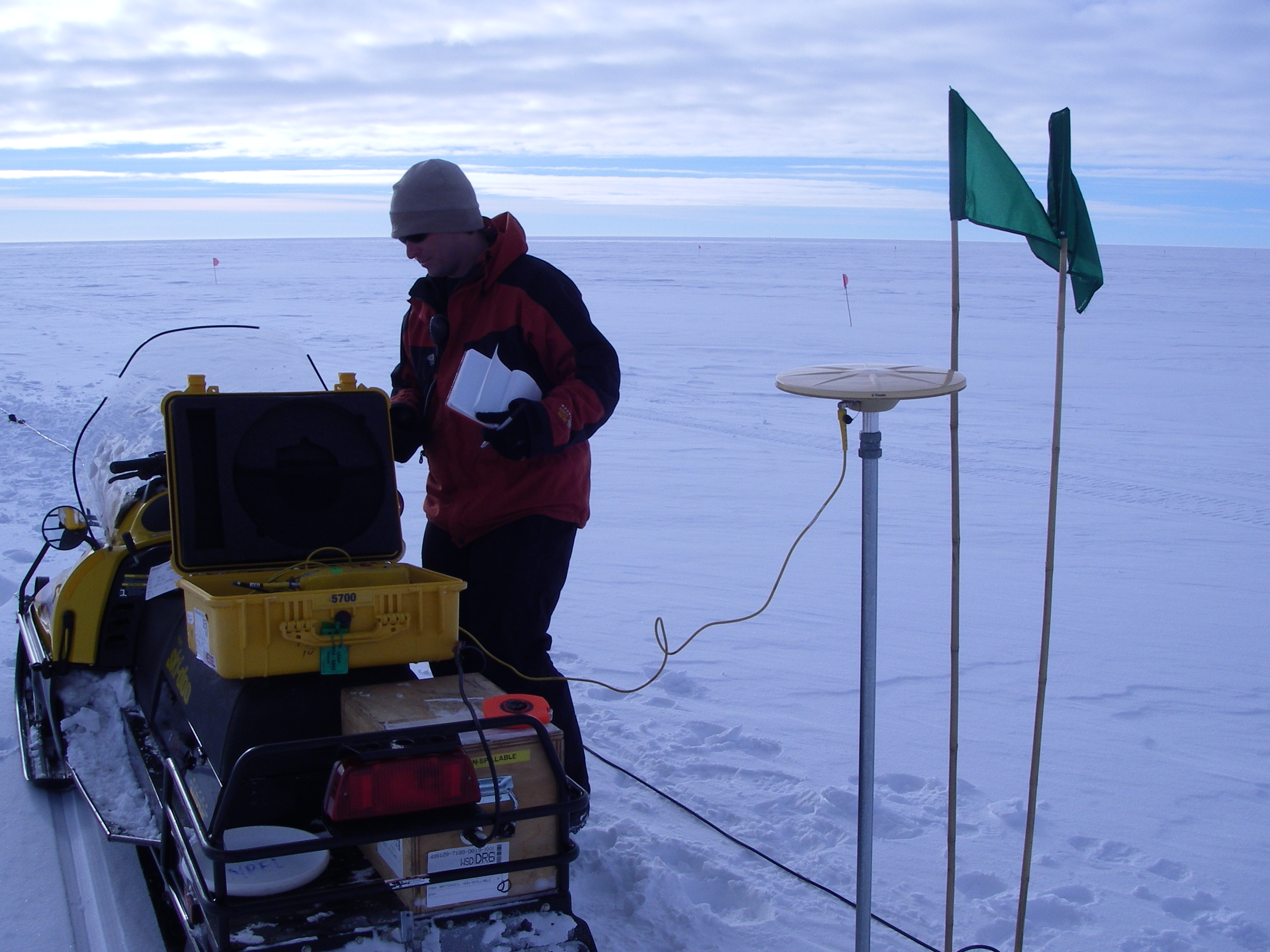Paul Winberry collects GPS data of the locations of the holes drillied for the explosives. WAIS Divide (West Antarctic Ice Sheet), Antarctica.