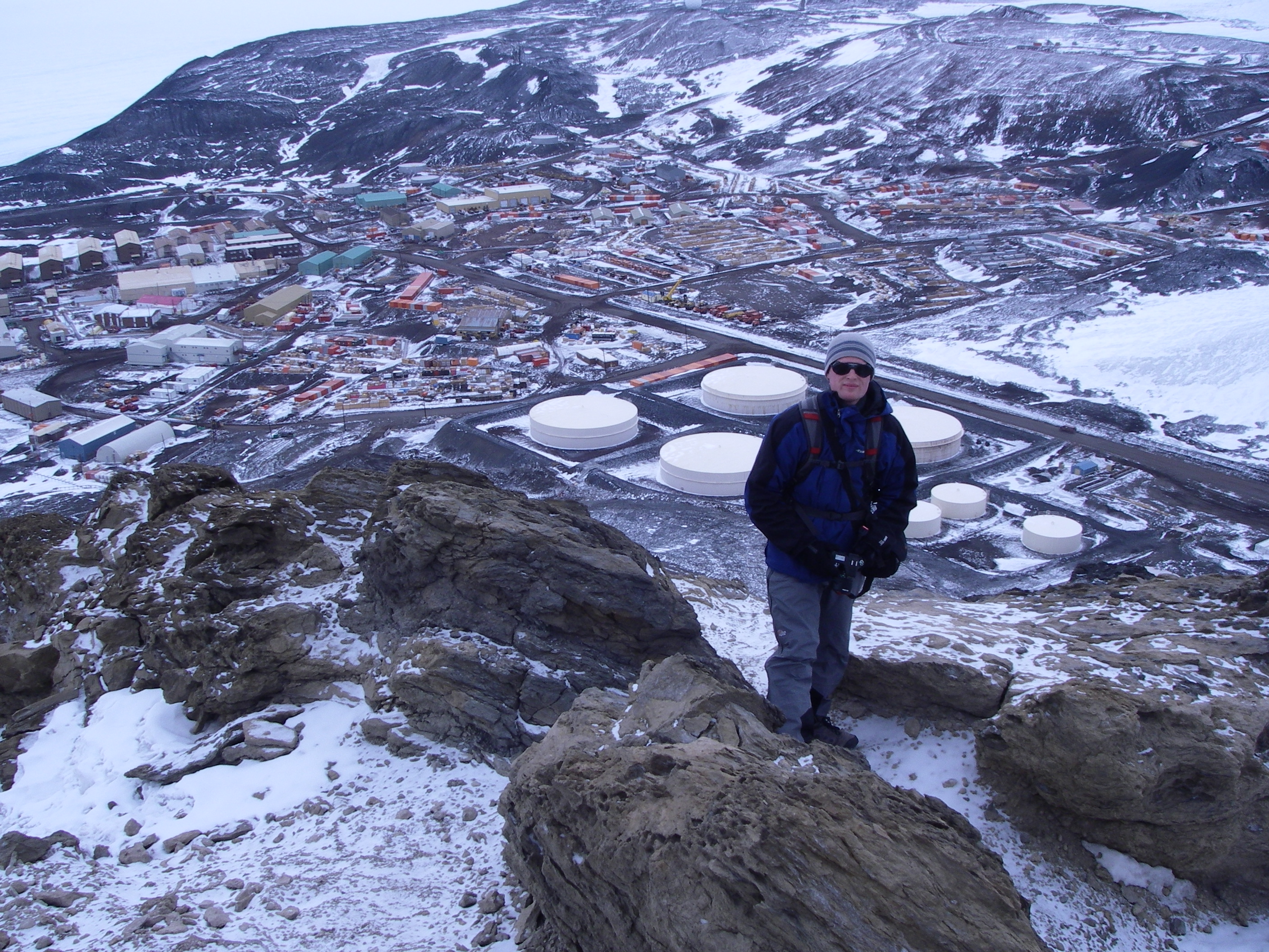 Knut Christianson on Observation Hill with a view of McMurdo Station in the background. Observation Hill, McMurdo Station, Antarctica.
