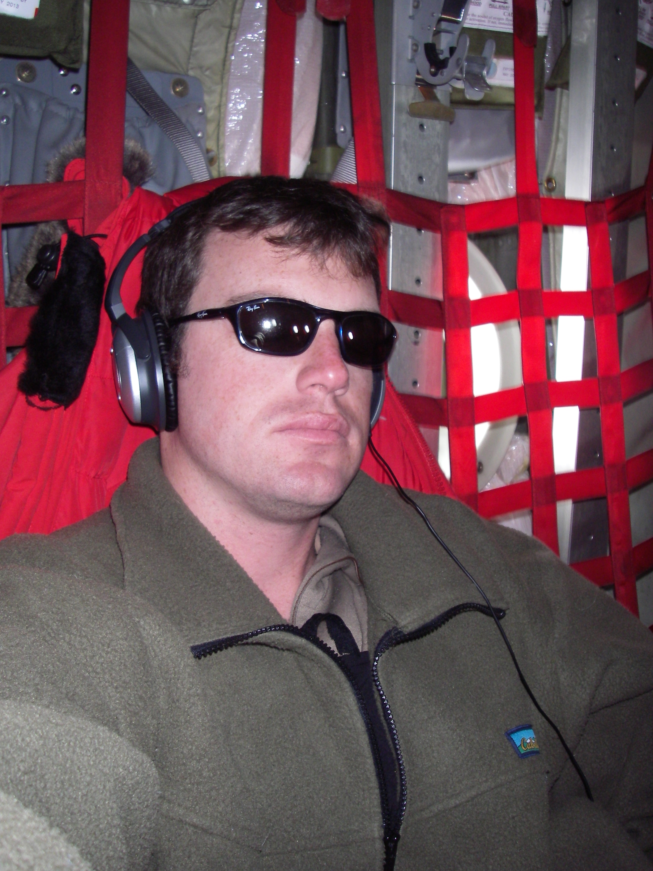 Brandon Gillette sits in the cargo seats of the C-130. Somewhere in the air between WAIS Divide and McMurdo Station, Antarctica.