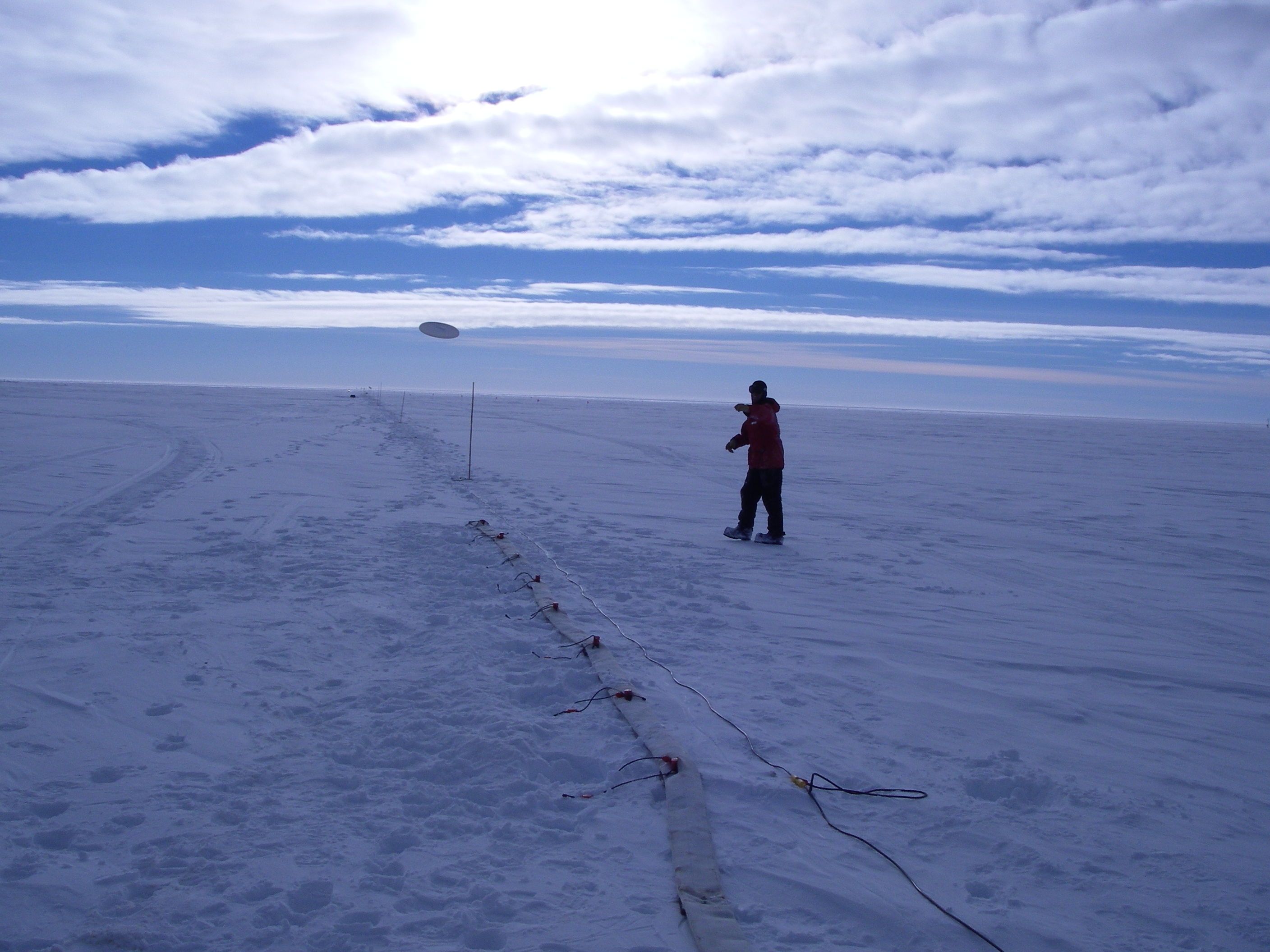 Brandon Gillette throwing the frisbee during some down time between explosive shots. WAIS Divide (West Antarctic Ice Sheet), Antarctica.