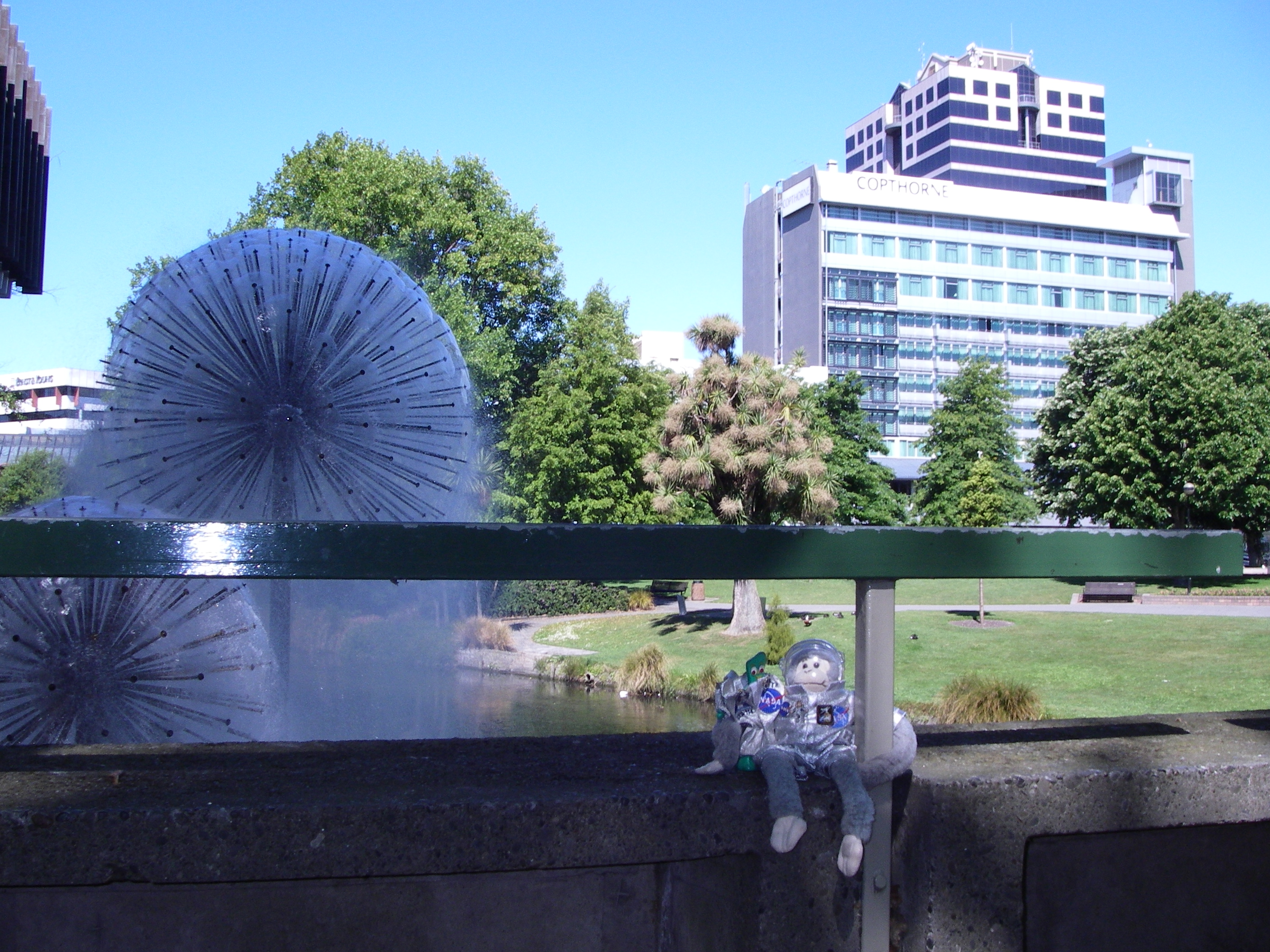 Gumby and Ms. Baker enjoying the cityscape in Christchurch near the Avon River. Christchurch, New Zealand.