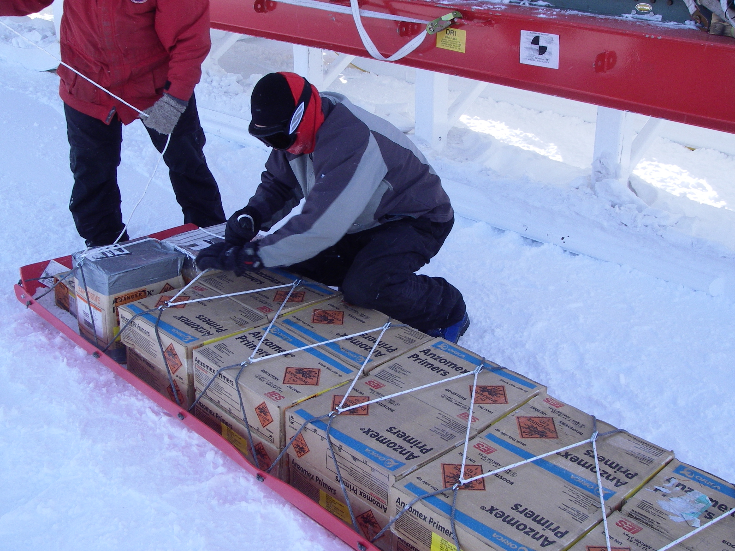 Leo Peters and Luke Zoet securing the explosives for transport nearly 3km from WAIS Divide (West Antarctic Ice Sheet), Antarctica.