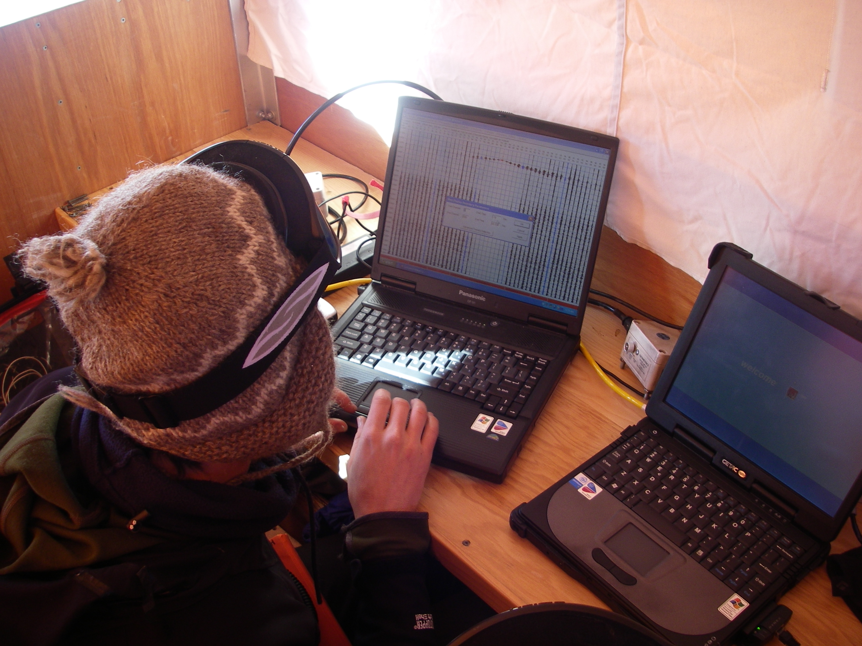 Huw Horgan in the Conestoga sled with seismic data visible on the computer monitor. WAIS Divide (West Antarctic Ice Sheet), Antarctica.