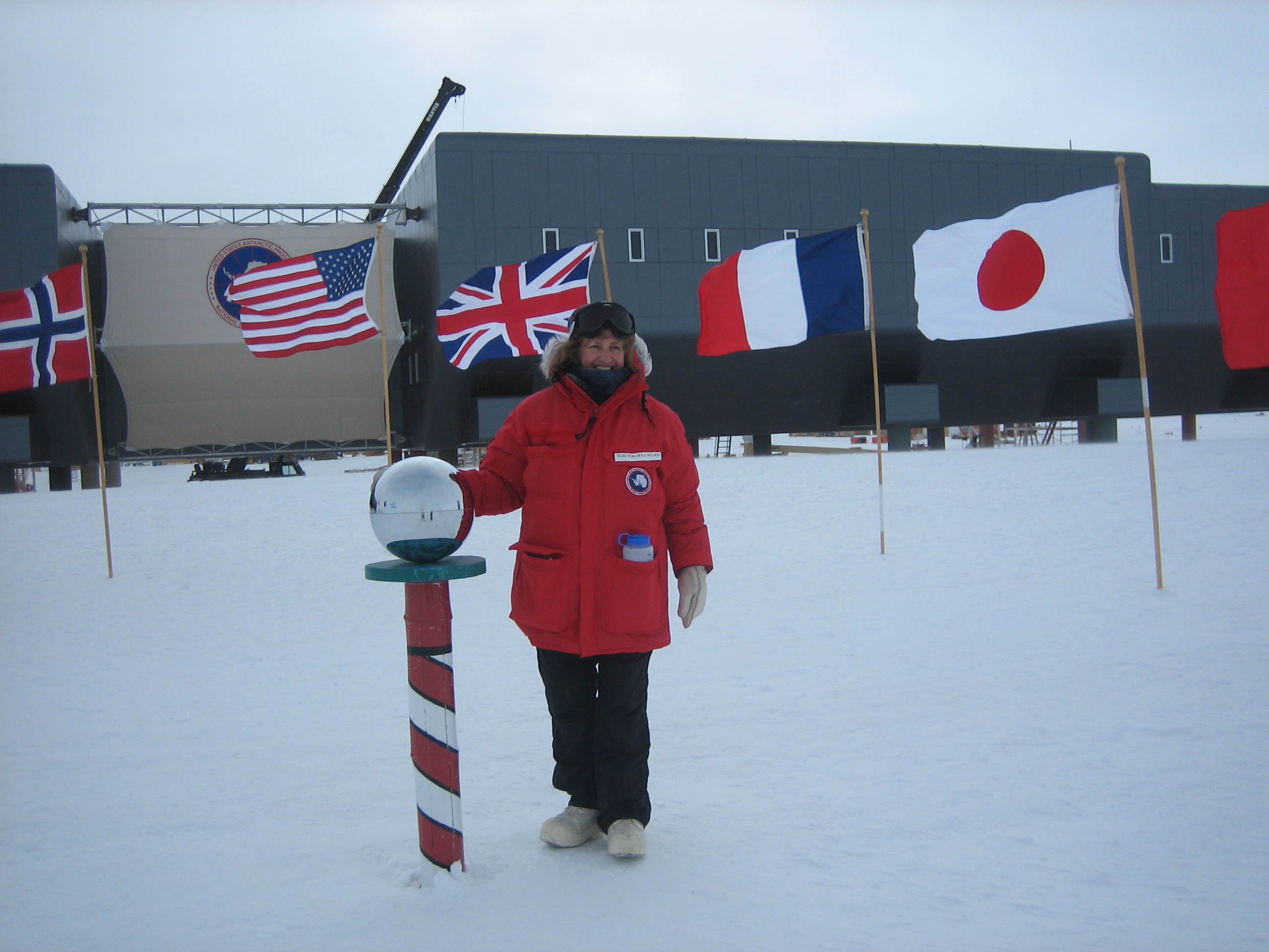 Elke Bergholz at the Ceremonial Pole, touching the traditional glass ball. The glass ball has been part of the designated pole since the International Geophysical Year (1957-58). The new elevated Amundsen-Scott South Pole Station is in the background with the NSF banner. This is Elke's last photo from the Pole. At 90 Degree South, the Geographic Pole of the Amundsen-Scott South Pole Station, Antarctica.