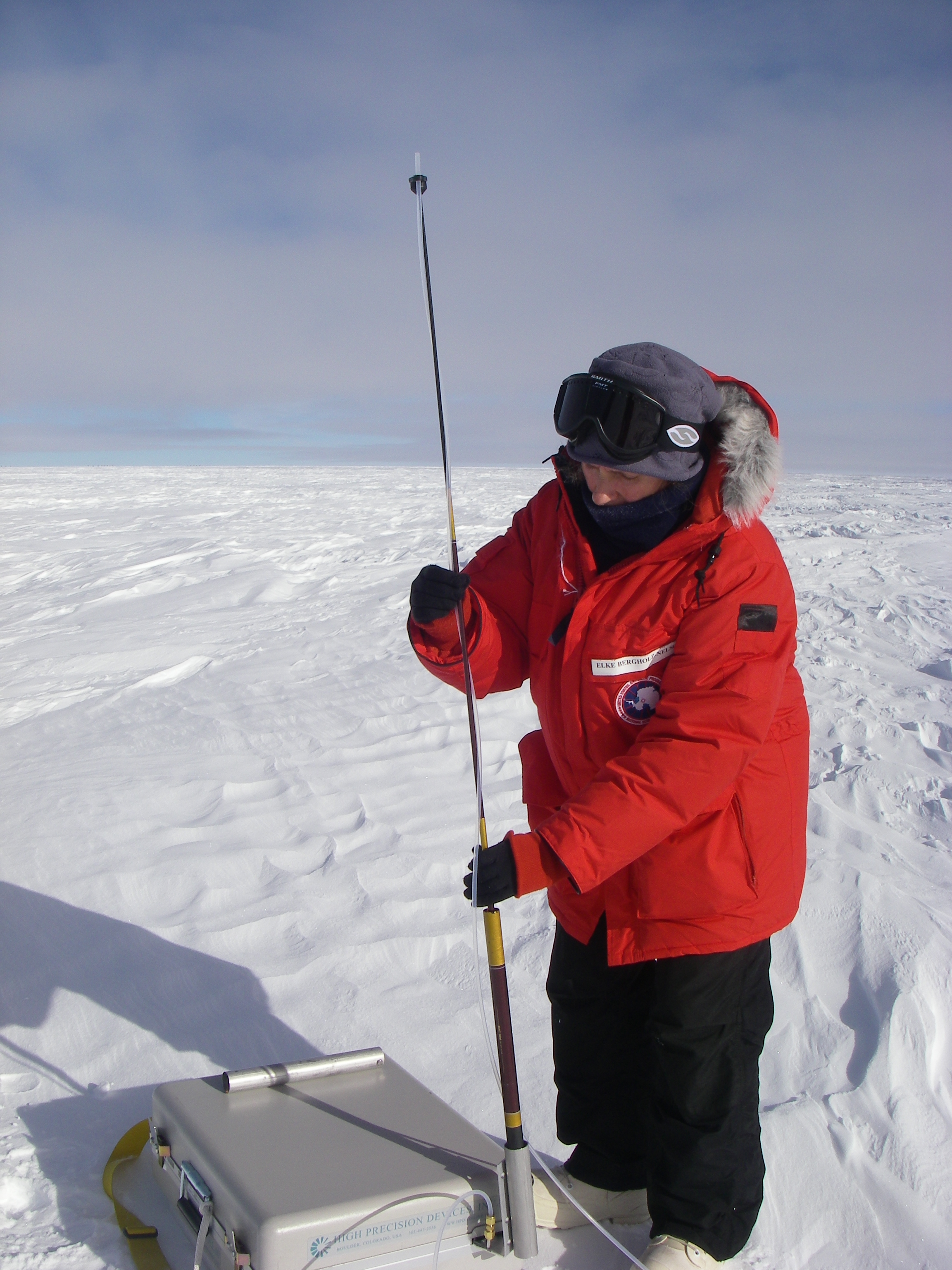 Elke Bergholz inside the Clean Air Sector outside the Atmospheric Research Observatory. She is folding the hose that collected the air form this area for further analysis. The field case contains special bottles for collecting CO2. This area has the cleanest air on earth and is used as the control. No plane is allowed to fly over this area and no one is allowed to enter this are without permission. In the background is the ARO building. The bottles inside the field case are then shipped to the NOAA lab in Boulder, Colorado. At the Clean Air Sector outside the Atmospheric Research Observatory (ARO), a quarter of a mile away from the main building of the Amundsen-Scott South Pole Station, Antarctica.