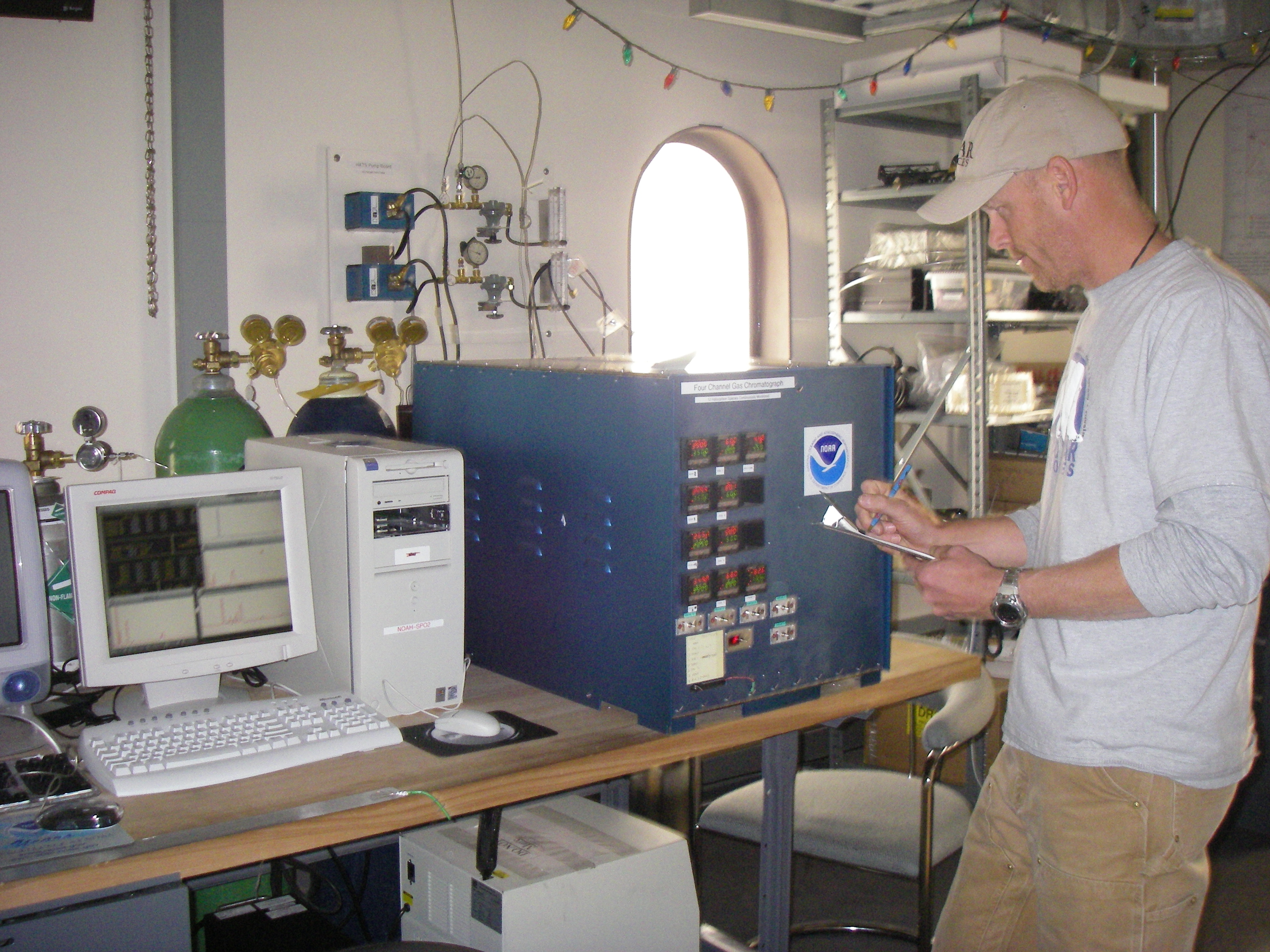NOAA team member Andy Clarke is taking data off the gas-chromatograph at the Atmospheric Research Observatory (ARO) Amundsen-Scott South Pole Station, Antarctica.