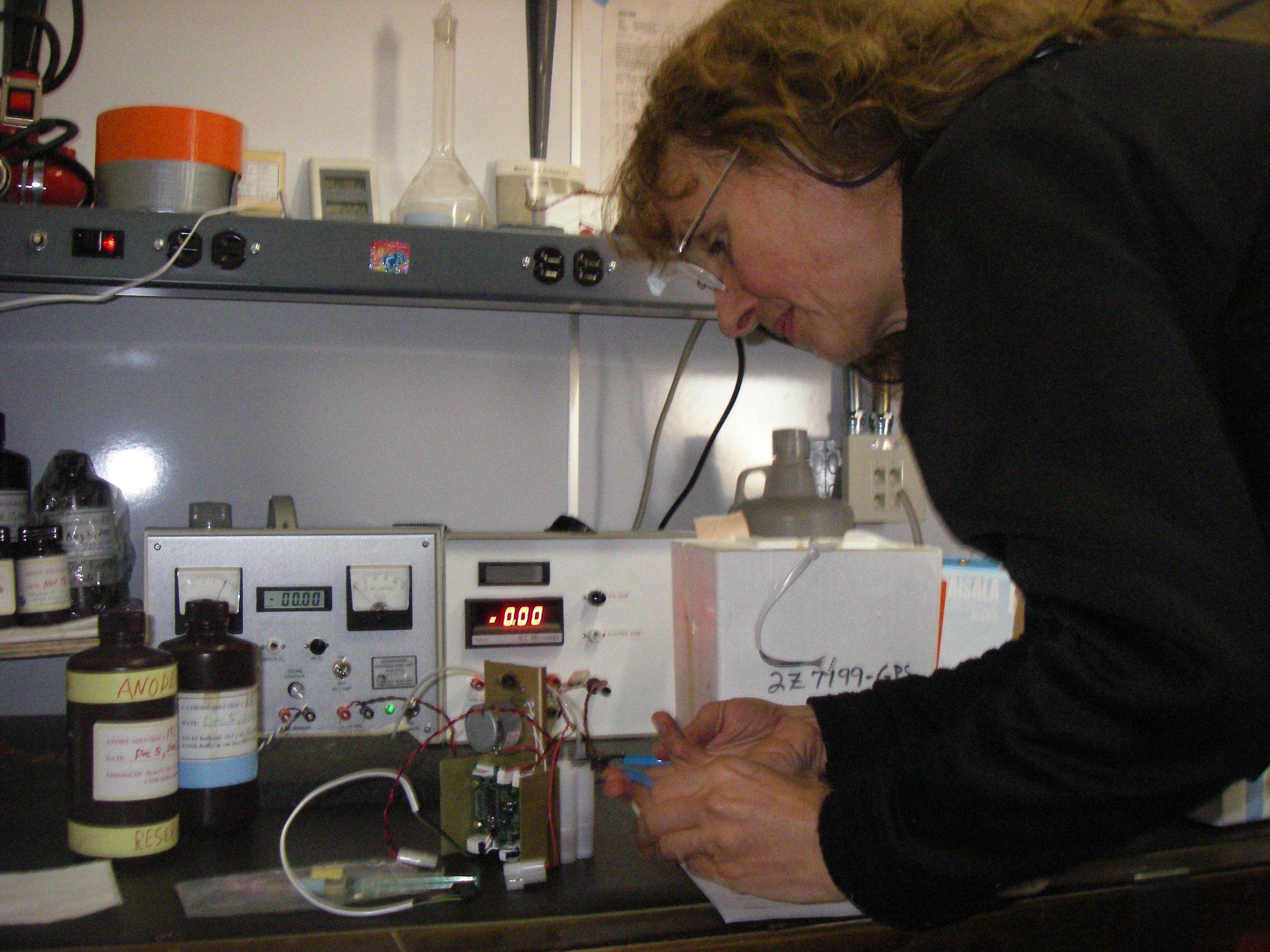 Elke Bergholz is preparing an ozonesode. She is closing the top of the chemical cells of the ozonesonde that now has new solutions. Inside the Balloon Inflation Facility (BIF), at the Amundsen-Scott South Pole Station, Antarctica.