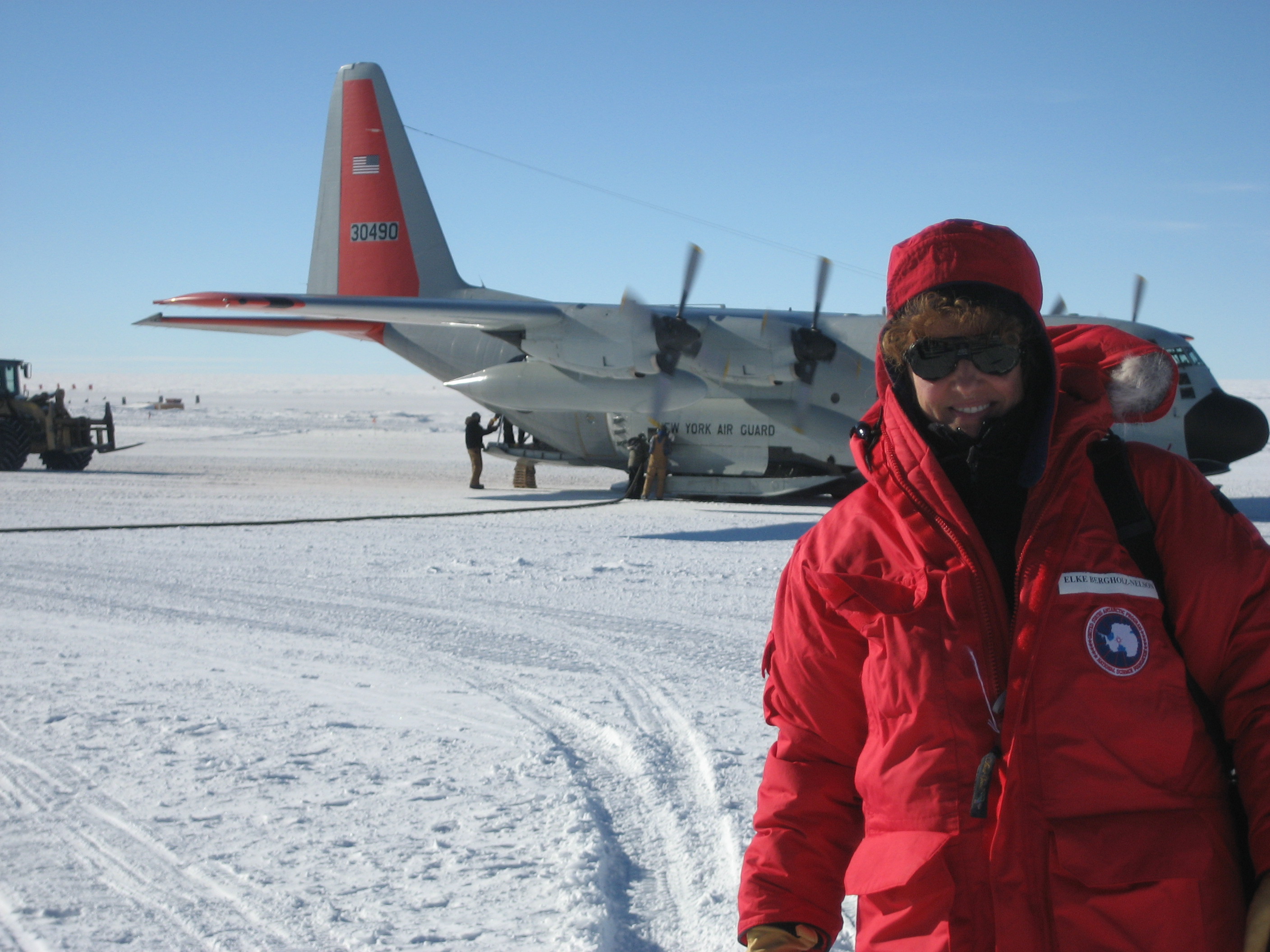 Elke Bergholz arriving at the South Pole. The C-130 or "Hercules" is in the background. At 90 Degree South, the Geographic Pole of the Amundsen-Scott South Pole Station, Antarctica.