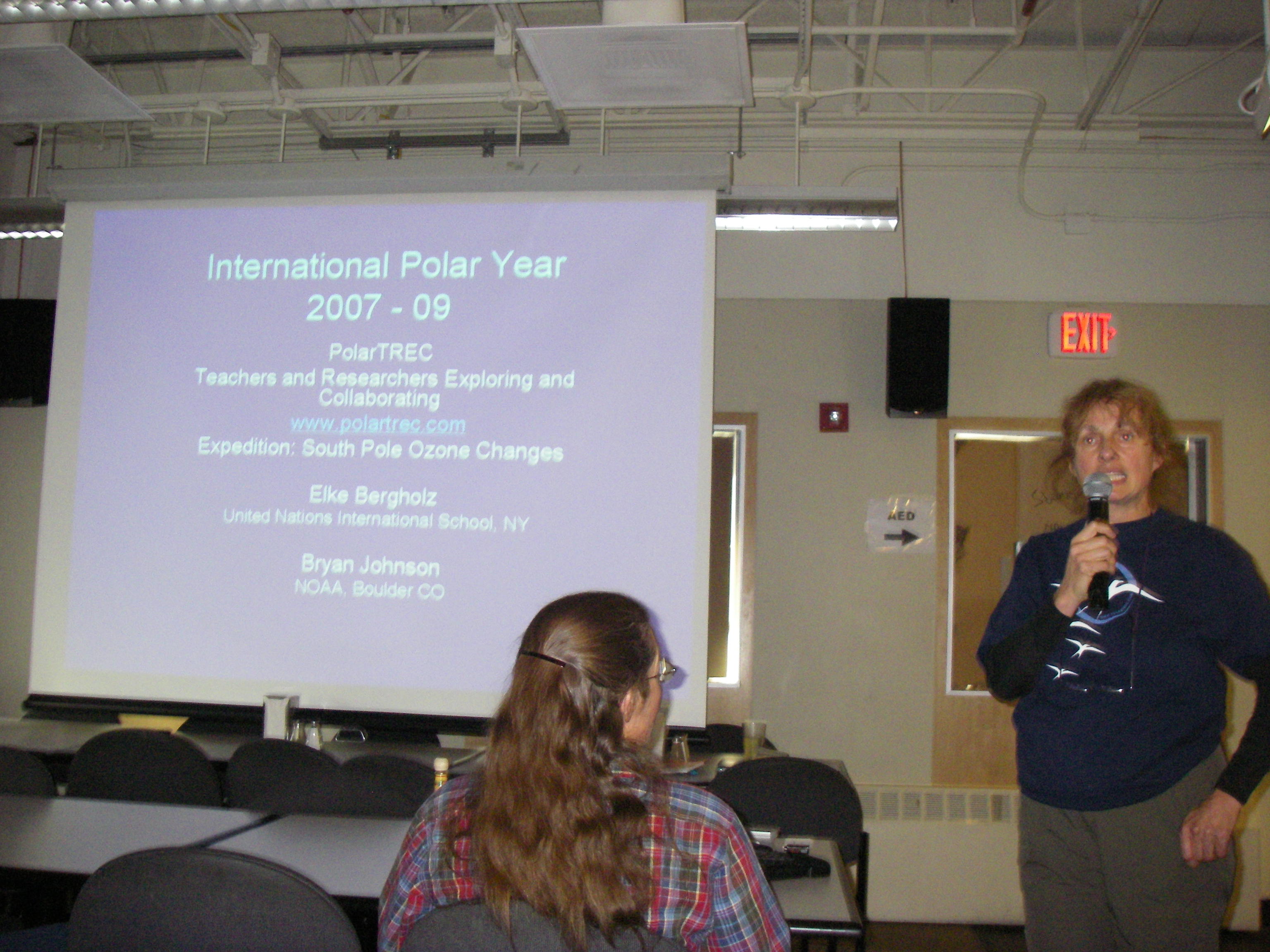Elke Bergholz starting her PolarTREC presentation during the Sunday night science lecture, at the dining hall of new elevated Amundsen-Scott South Pole Station, Antarctica.