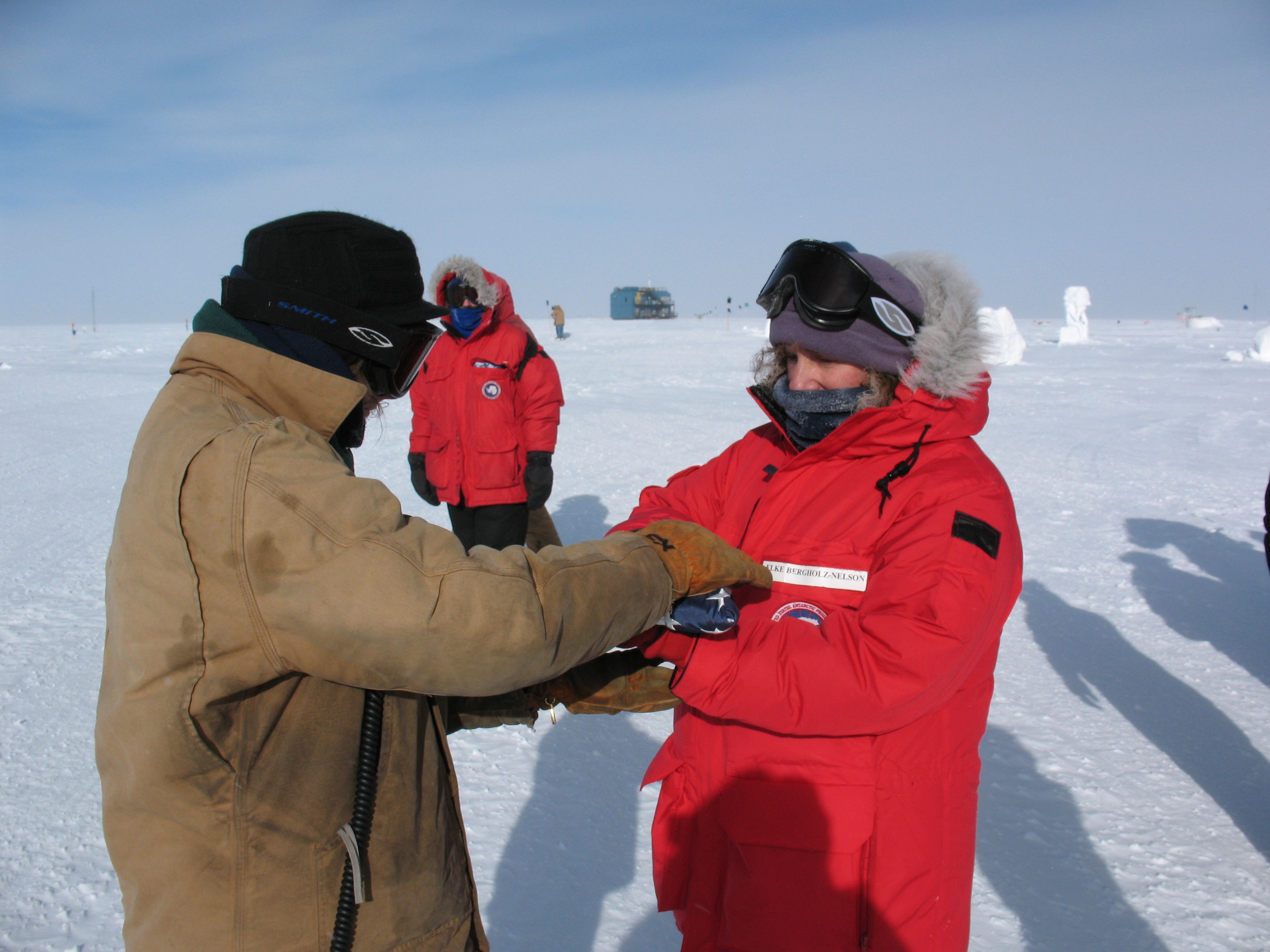 Elke Bergholz is handing over the folded flag to the next station member in the daisy line for transfer of the flag from the Old Dome to the Geographic Pole for refolding for the dedication. At 90 Degree South, the Geographic Pole of the Amundsen-Scott South Pole Station, Antarctica.