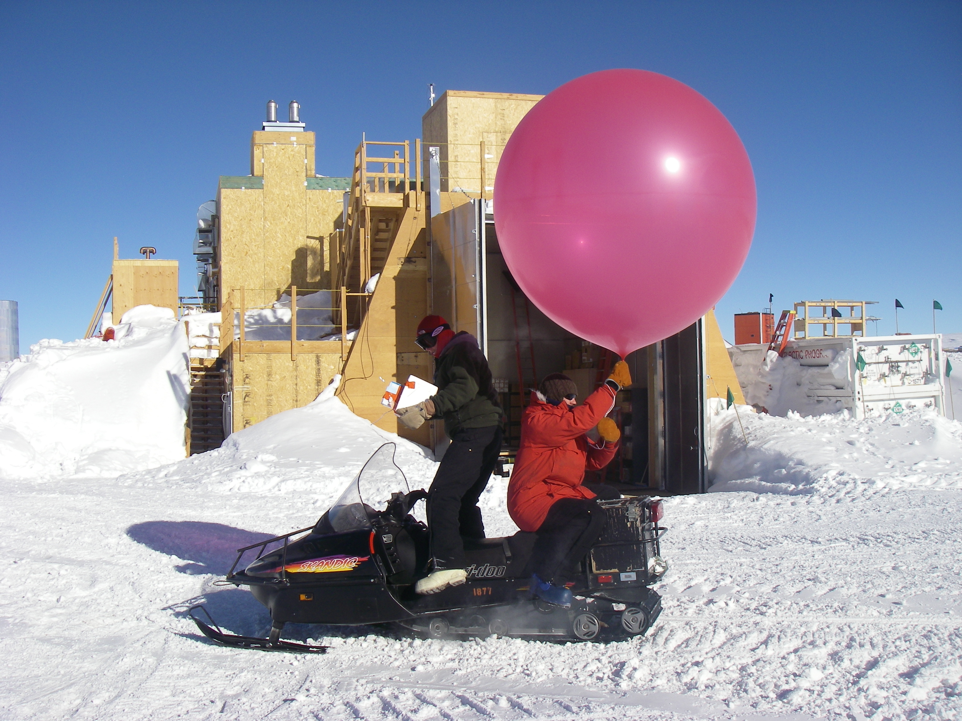 NOAA team member Andy Clarke and Patrick Cullins starting the snowmobile to transport the pink surface ozone balloon to launch outside the station, for possible retrieving near the BIF. In front of the NOAA Balloon Inflation Facility at the Amundsen-Scott South Pole Station.