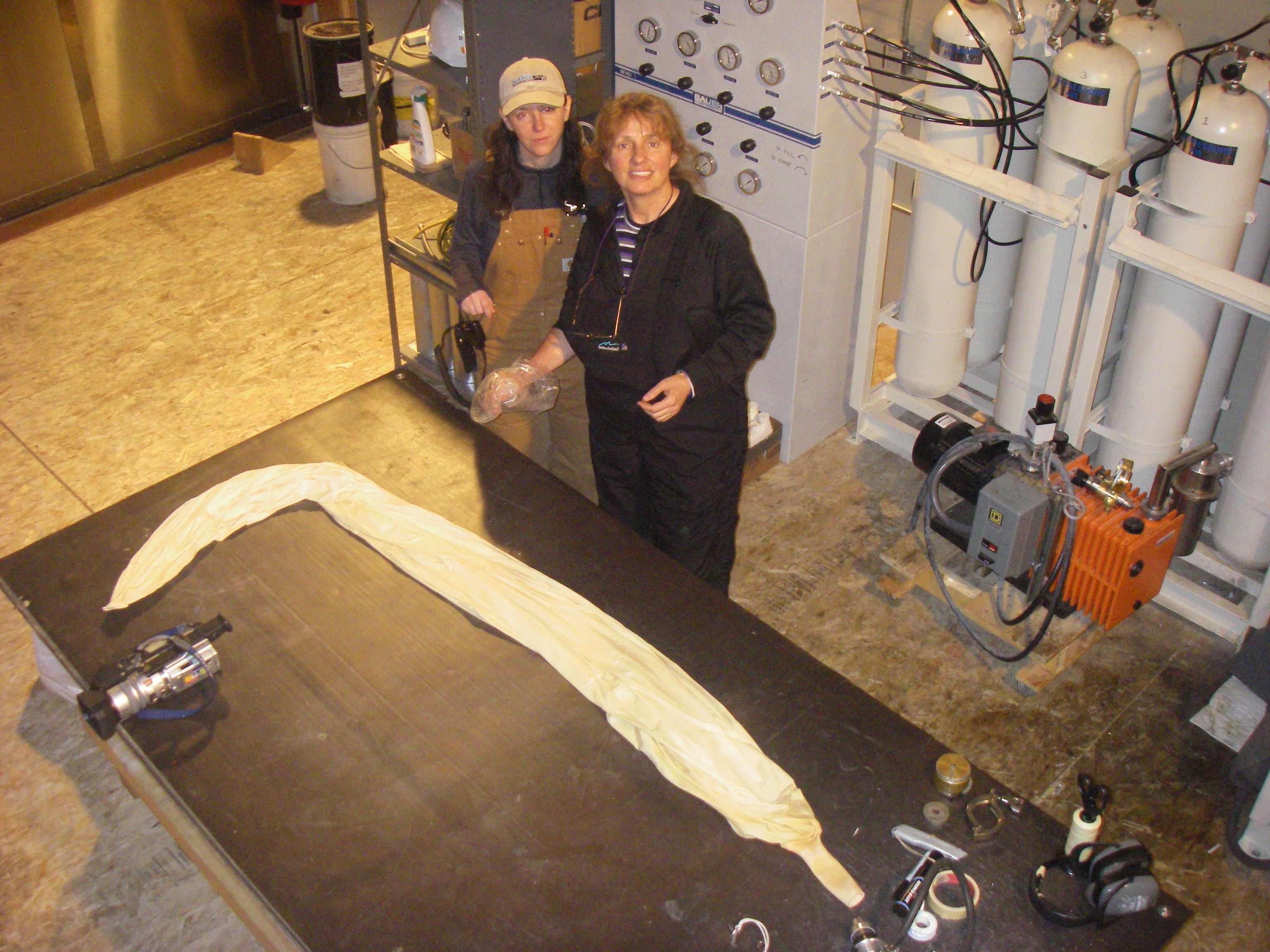Elke Bergholz completed laying out the stratospheric balloon as NOAA team member Amy Cox stands by for further instructions. They are ready to inflate the balloon. Inside the Balloon Inflation Facility (BIF) at the Amundsen-Scott South Pole Station, Antarctica.