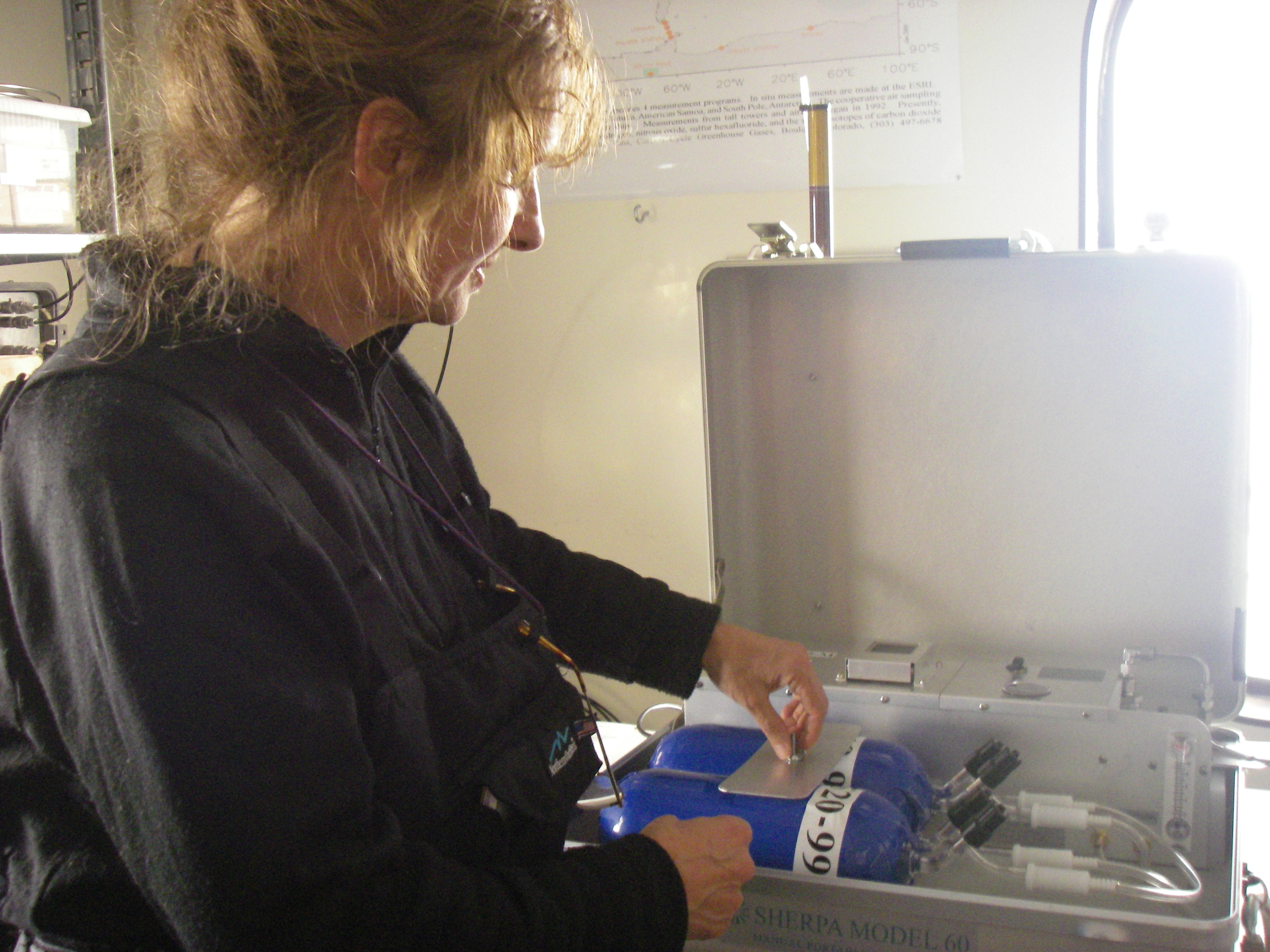Elke Bergholz inside the Atmospheric Research Observatory (ARO). She is securing the special bottles for collecting CO2 inside the field case in preparation for the collection outside in the Clean Air Sector. Inside the Atmospheric Research Observatory (ARO), a quarter of a mile away from the main building of the Amundsen-Scott South Pole Station, Antarctica.