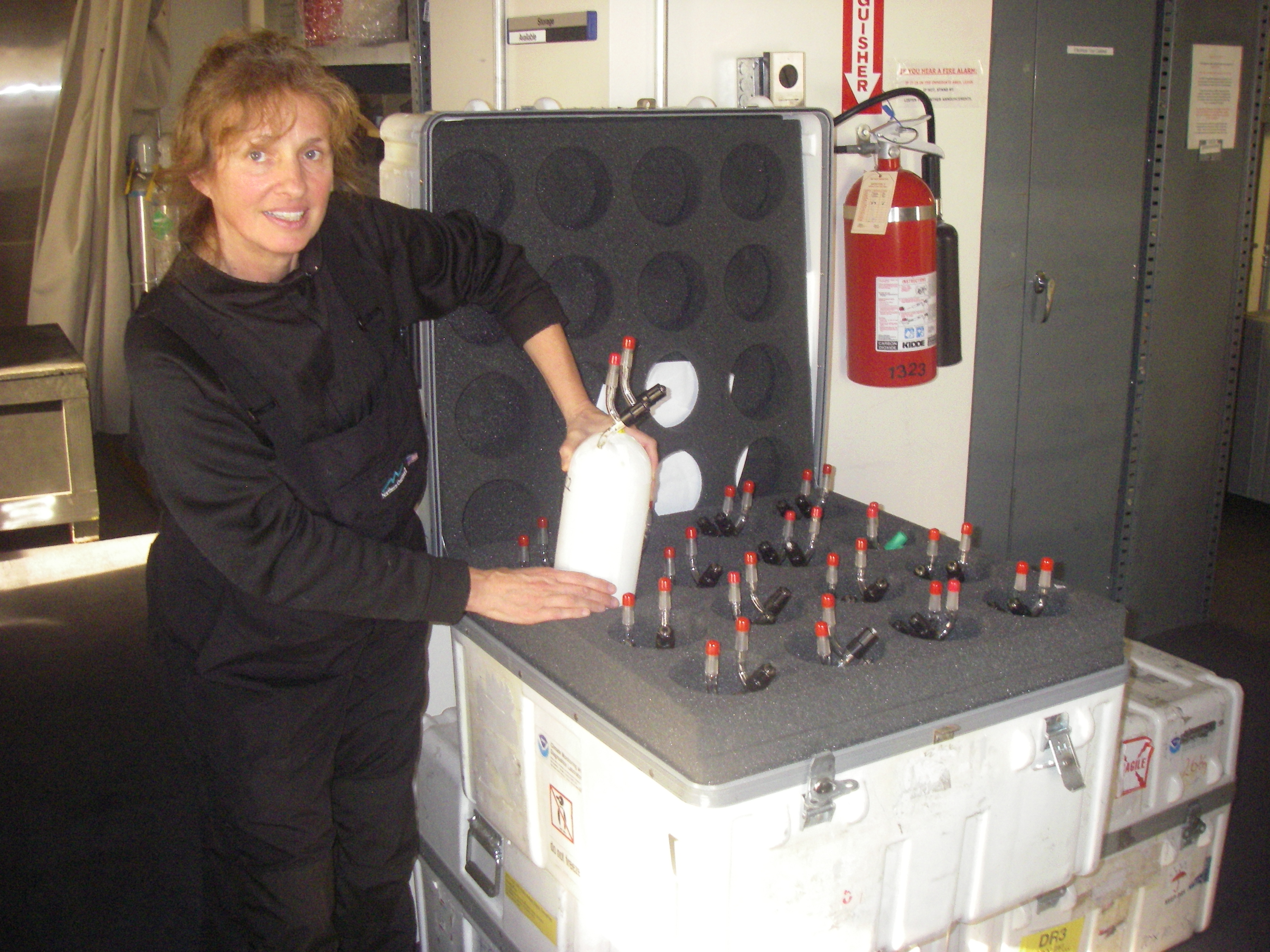 Elke Bergholz is placing CO2 bottles inside a shipping case. At the Atmospheric Research Observatory (ARO), Amundsen-Scott South Pole Station, Antarctica.