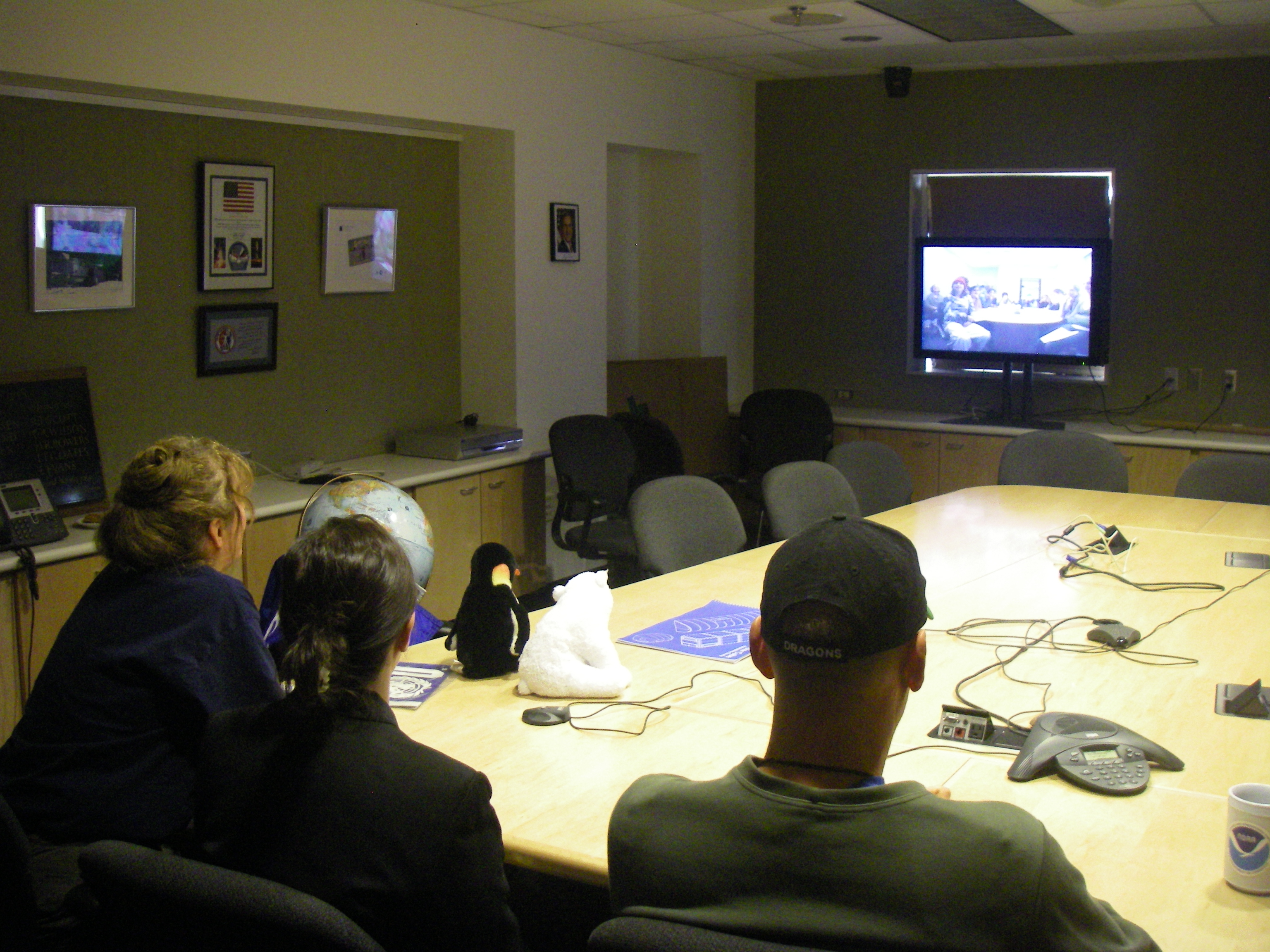 Elke Bergholz, NOAA officer Amy Cox, and NOAA science specialist Andy Clarke are observing students in New York during a video conference. The broadcast was live and the team answered the students' questions about their science and life at the station. Inside the conference room in the new elevated Amundsen-Scott South Pole Station, Antarctica.