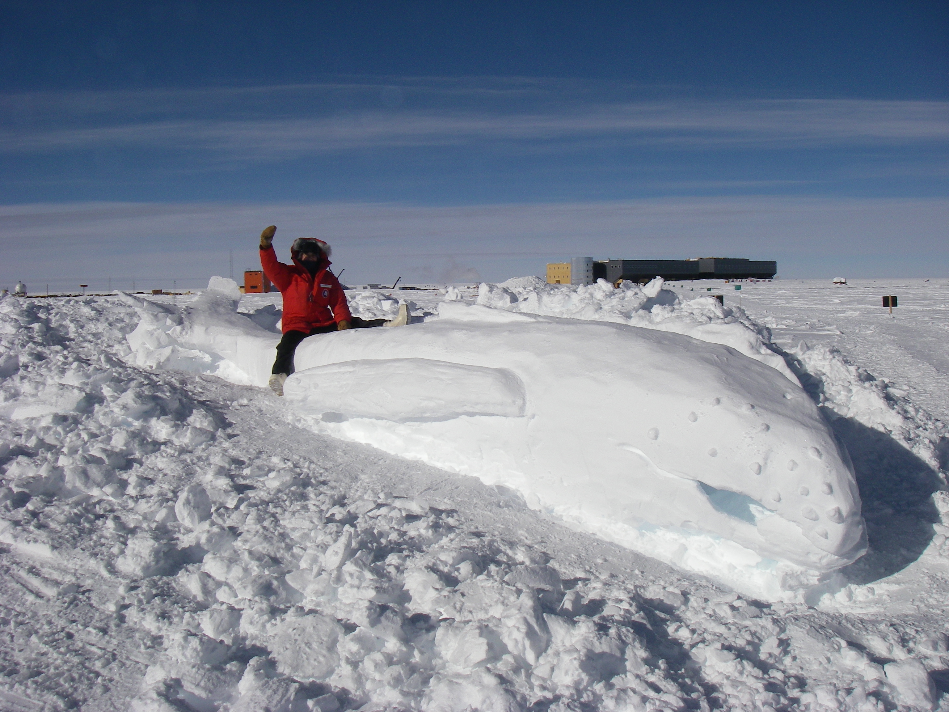 Elke Bergholz taking a ride on top of Patrick Cullins' whale ice sculpture outside of the NOAA Atmospheric Research Laboratory (ARO). She is waving to her students! The new elevated Amundsen-Scott South Pole Station, Antarctica, is in the background.