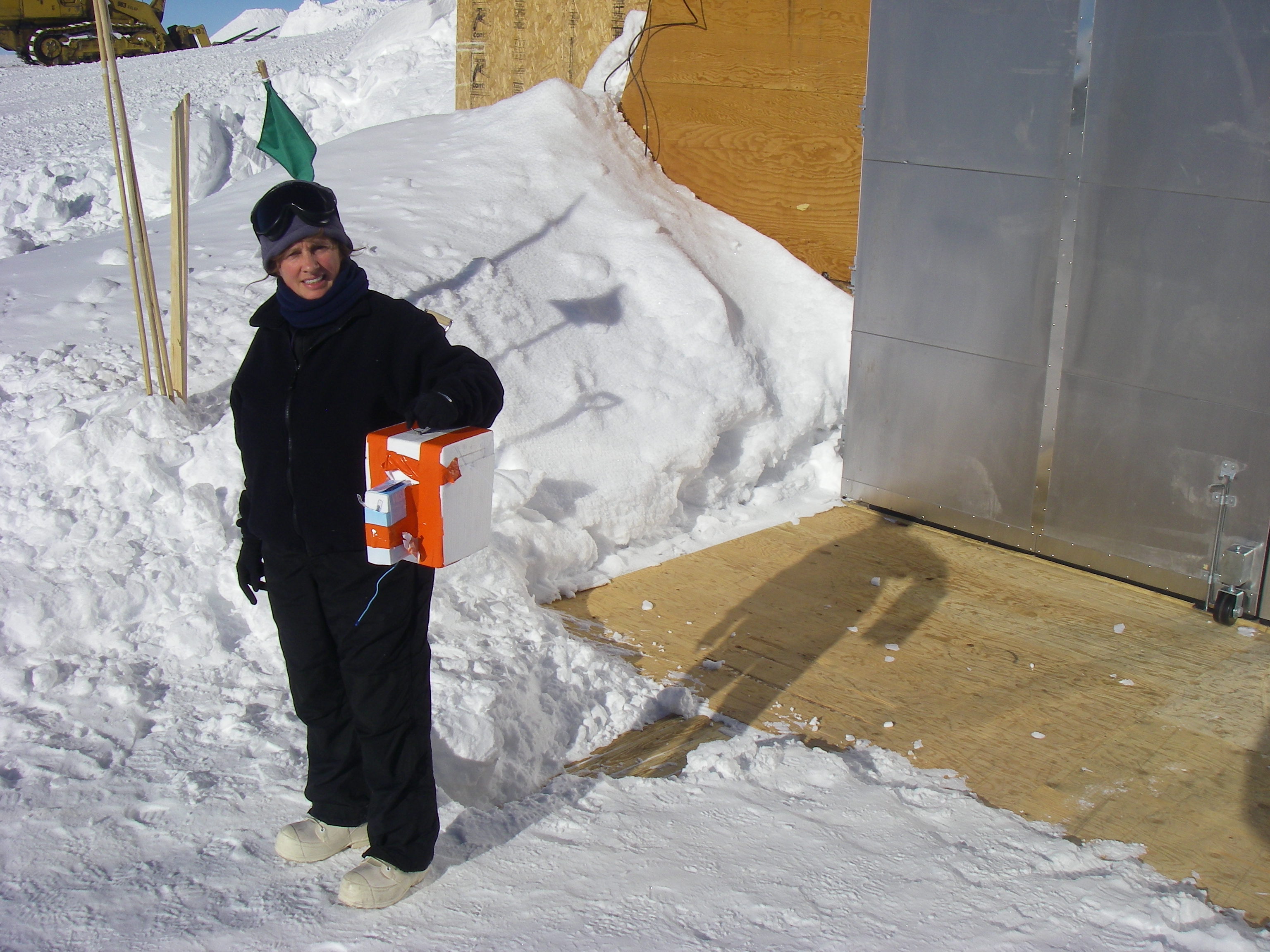 Elke Bergholz is carrying the ozonesonde outside the NOAA Balloon Inflation Facility (BIF) for temperature adjustment and surface ozone calibration. In front of the BIF at the Amundsen-Scott South Pole Station, Antarctica.