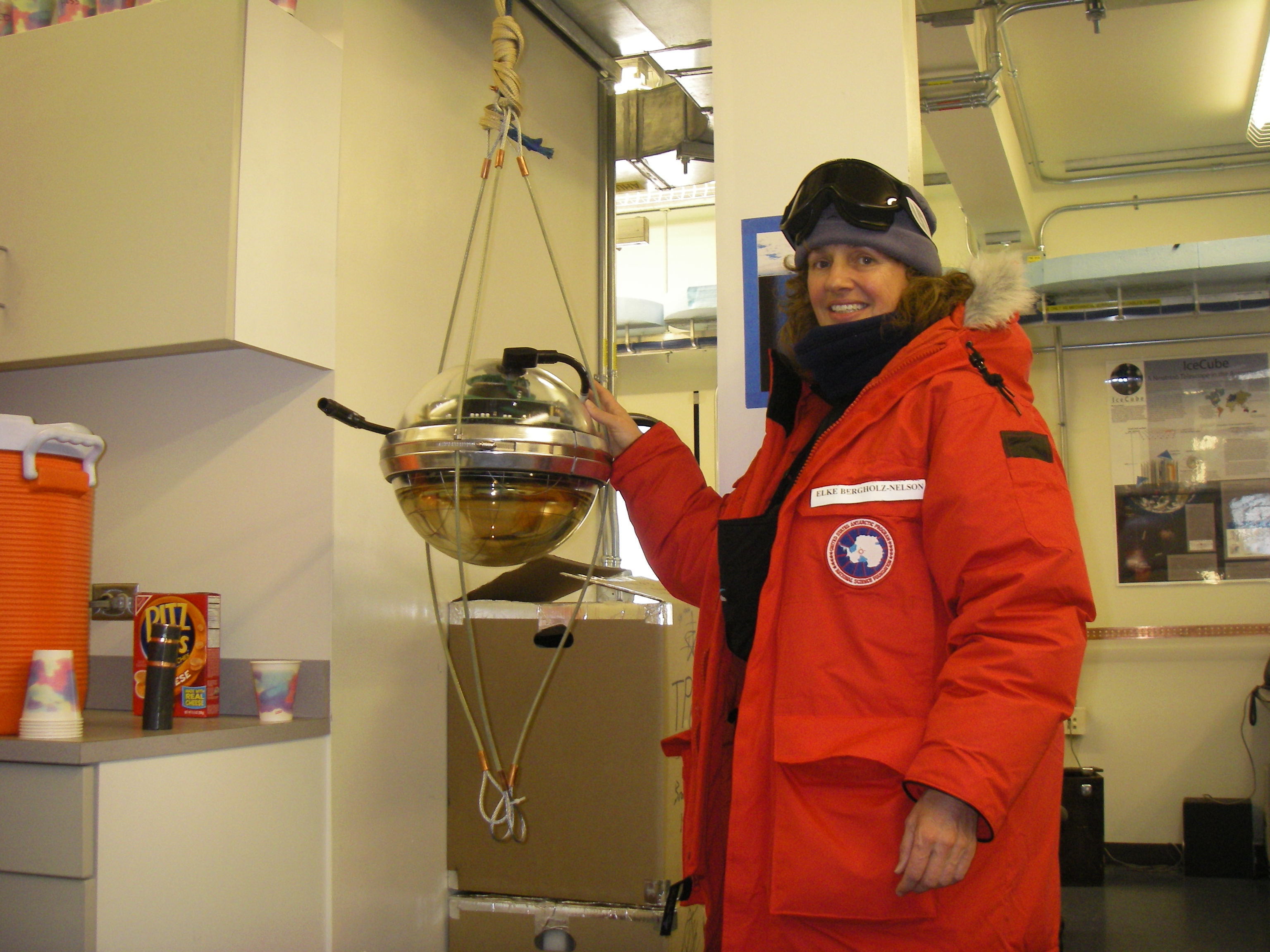 Elke Bergholz pointing out a DOM, Digital Optical Module, a neutrino detector of the IceCube project at the South Pole Station. DOMs are placed on strings into holes up to 2500 meters deep into the ice. They are detecting neutrinos which help astrophysicists determine the expansion of the universe, among other things. Near the Dark Sector, about 1/2 a mile away from the Amundsen-Scott South Pole Station, Antarctica.