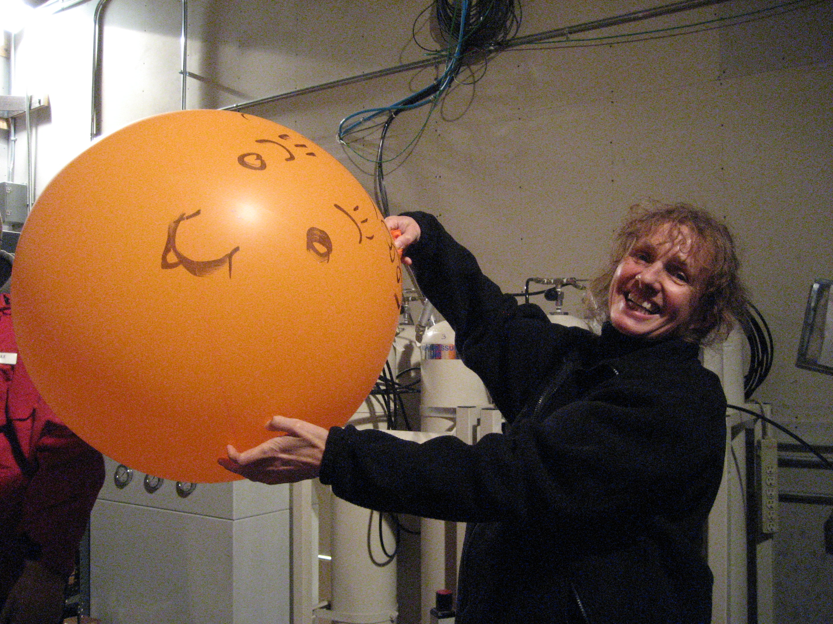 Elke Bergholz is showing off the decorated sealing balloon. Inside the Balloon Inflation Facility (BIF), at the Amundsen-Scott South Pole Station, Antarctica.