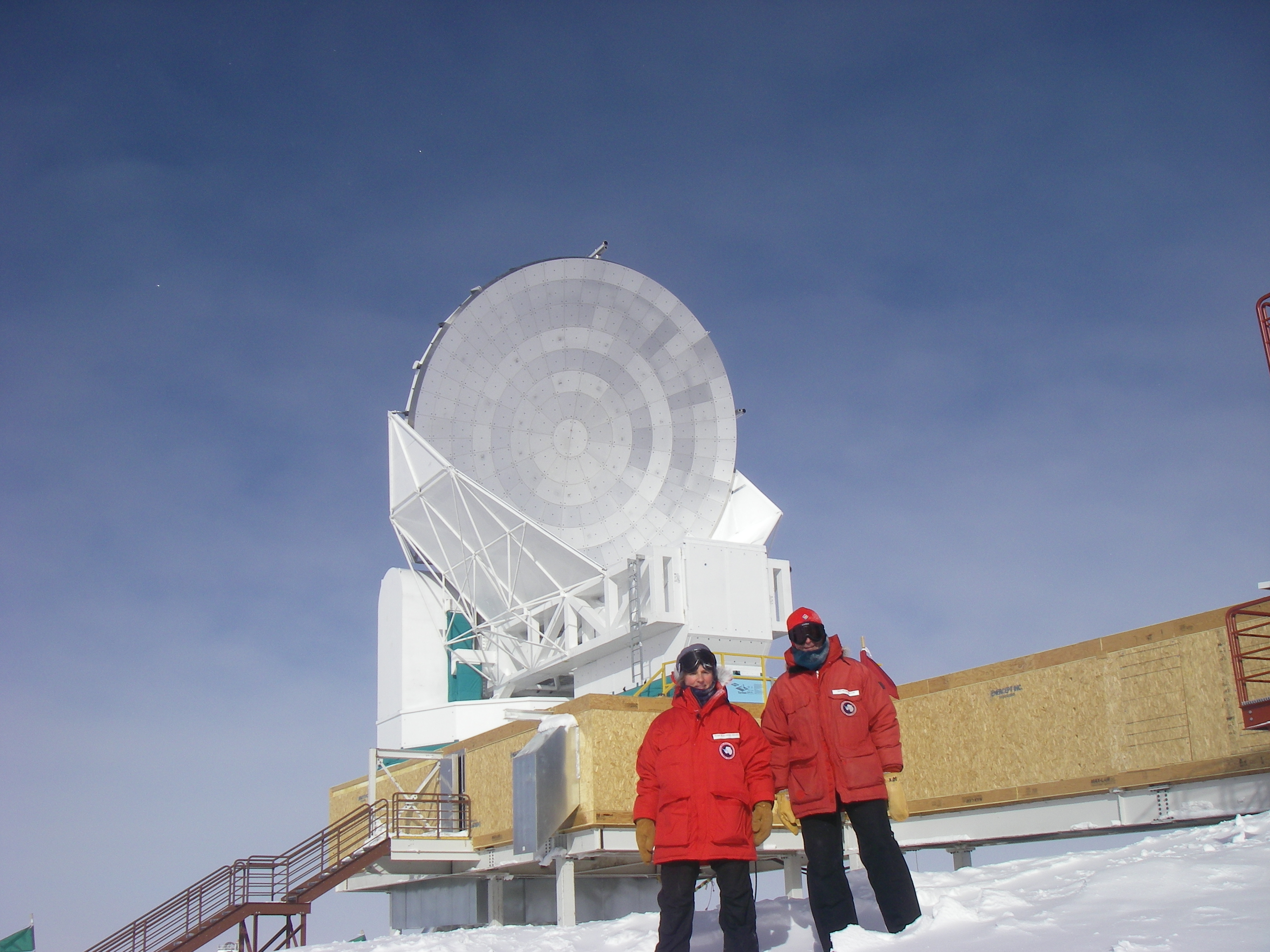 Elke Bergholz and Helmuth Spieler in front of the South Pole Telescope. Dark Sector of the South Pole Station, about 1/2 mile away from the new elevated Amundsen-Scott South Pole Station, Antarctica.