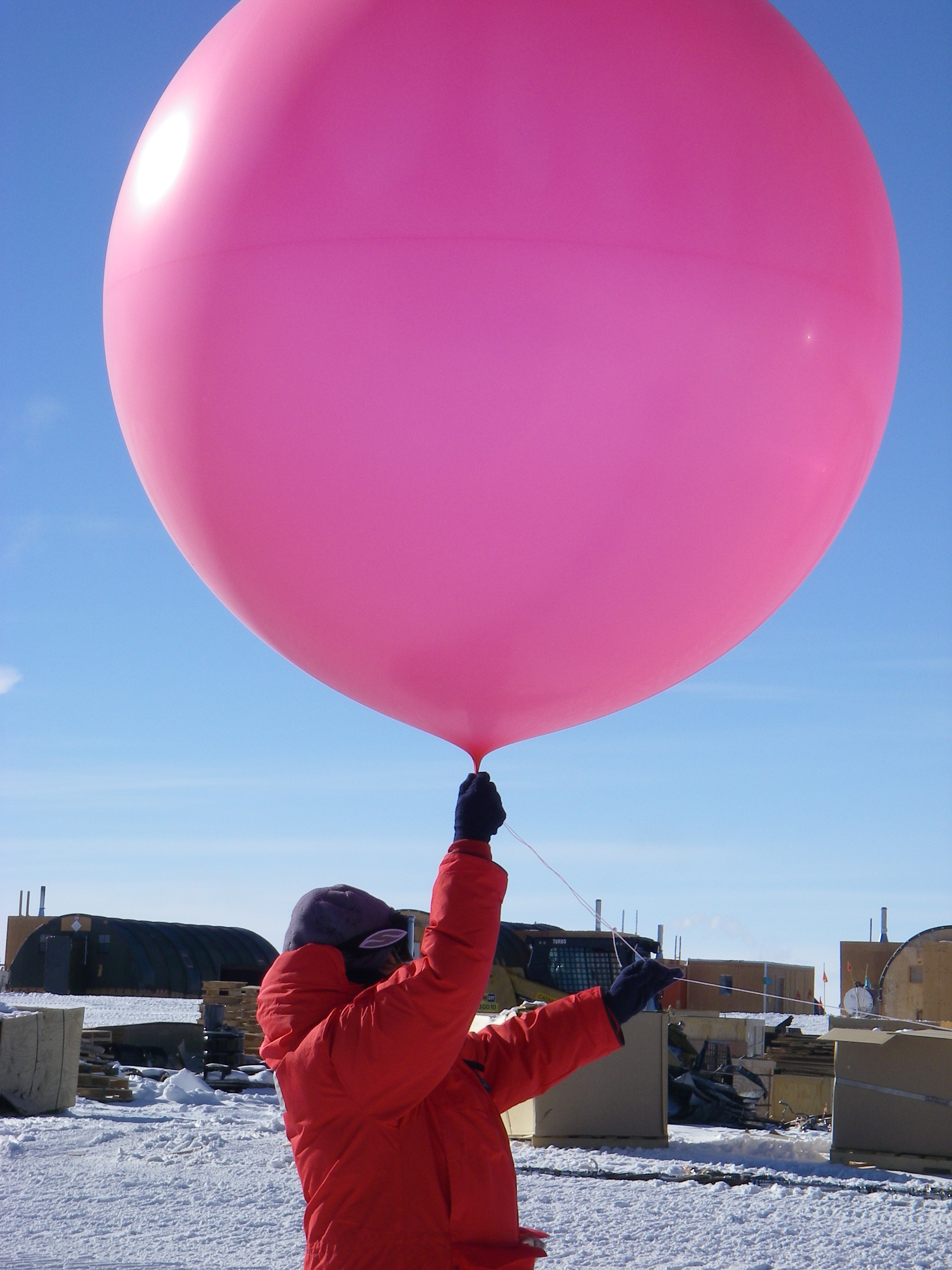 Elke Bergholz is holding the pink surface ozone balloon ready to be launched. Outside of the Balloon Inflation Facility at the Amundsen-Scott South Pole Station, Antarctica.