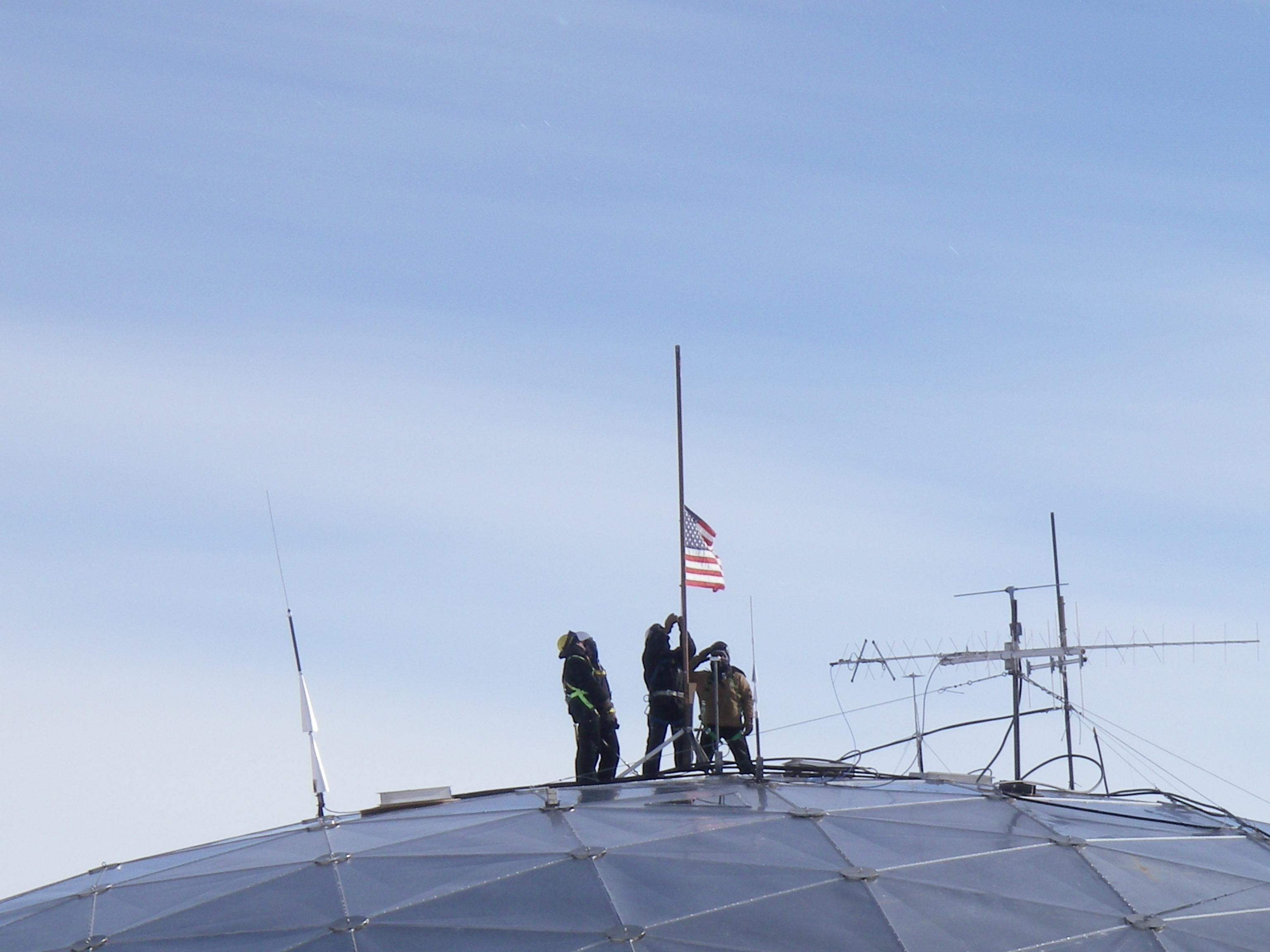 New Station Dedication Day: The historic moment when workers of the station remove the flag from the top of the old dome. The flag was later to be hoisted over the new elevated station. 90 Degree South, Amundsen-Scott South Pole Station, Antarctica.