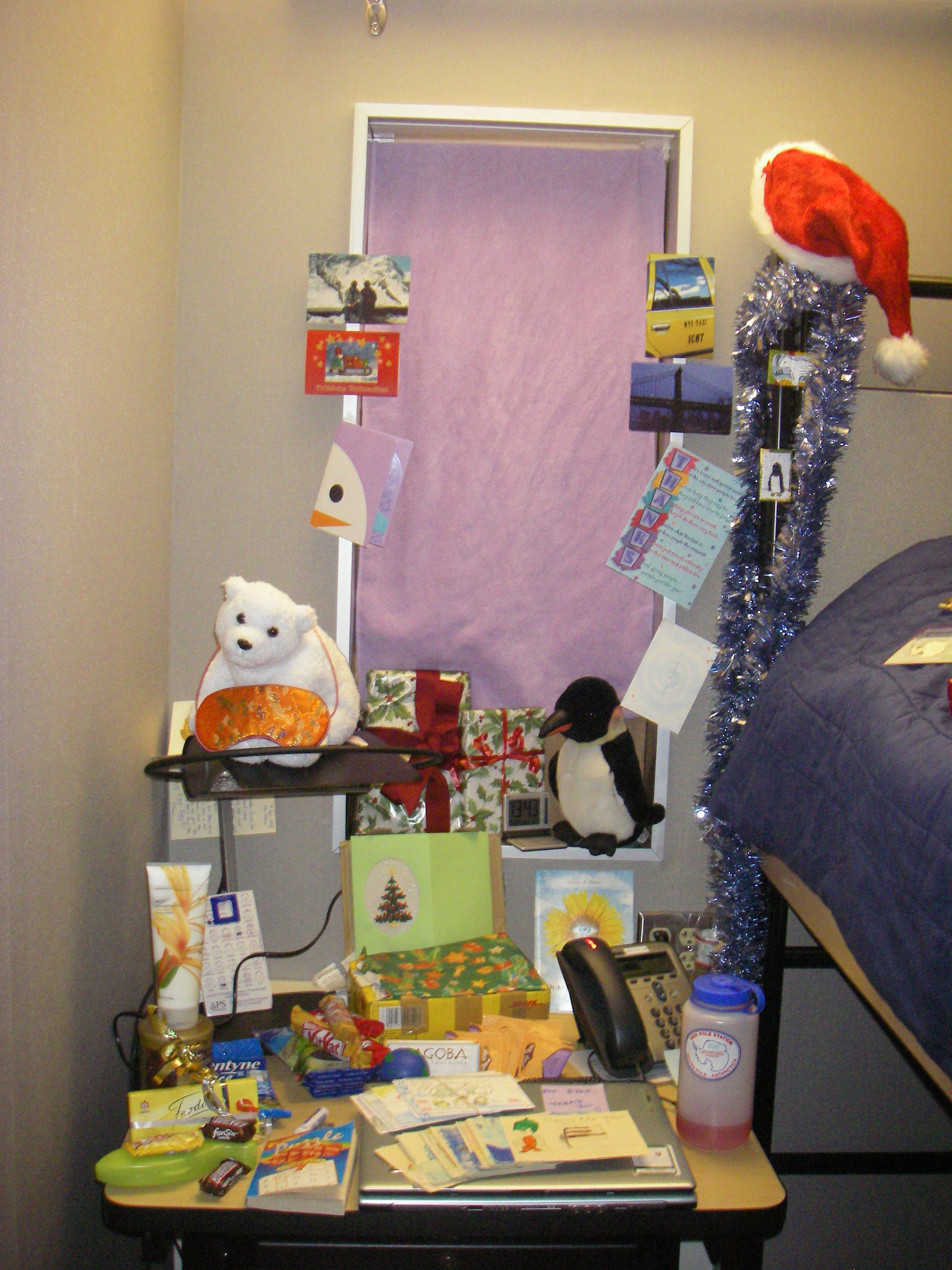Elke Bergholz's room Christmas Eve decorated for Christmas day. Notice that the window is covered so the room can stay dark for better sleeping. Inside Elke's room at the Amundsen-Scott South Pole Station, Antarctica.